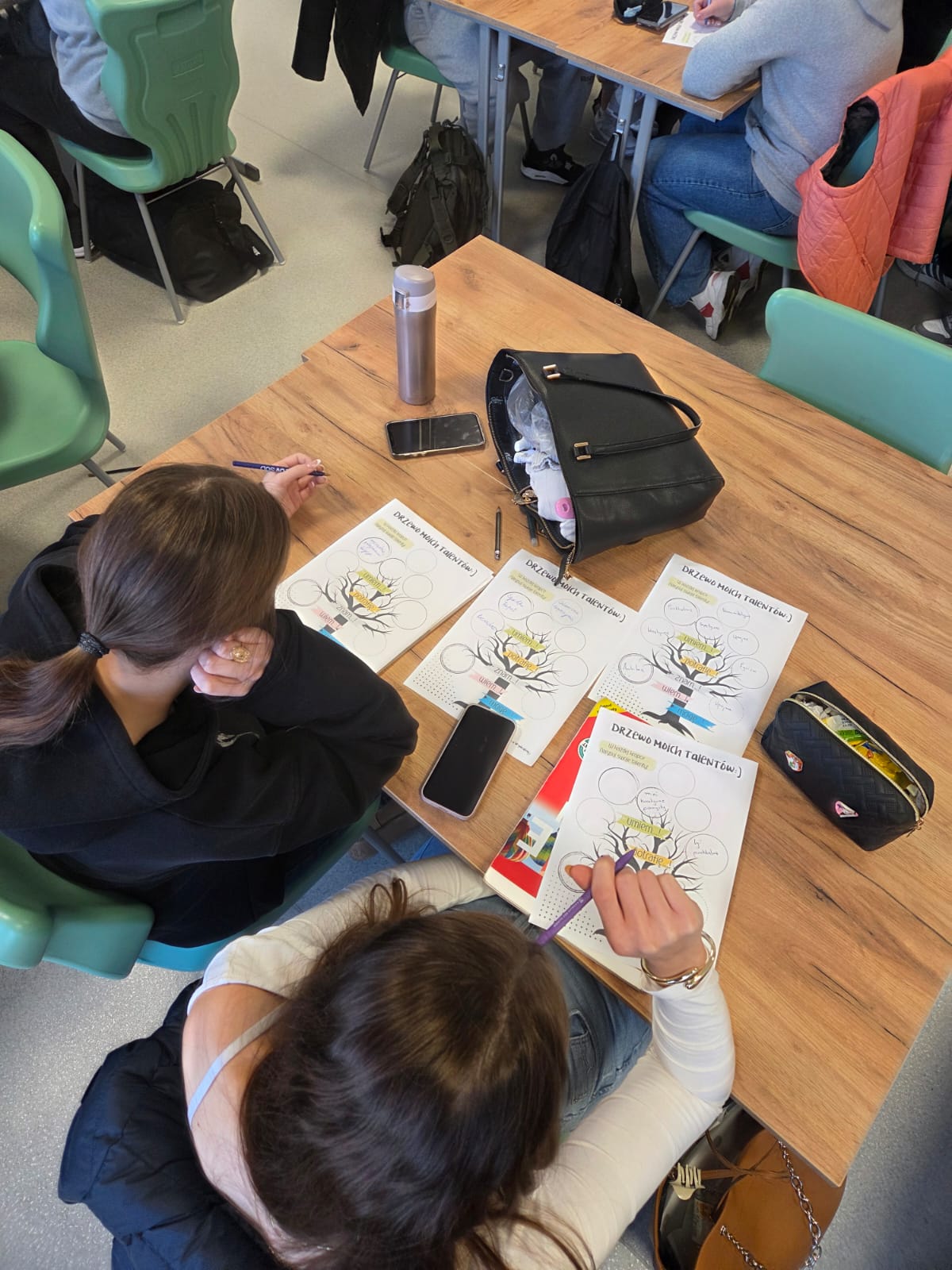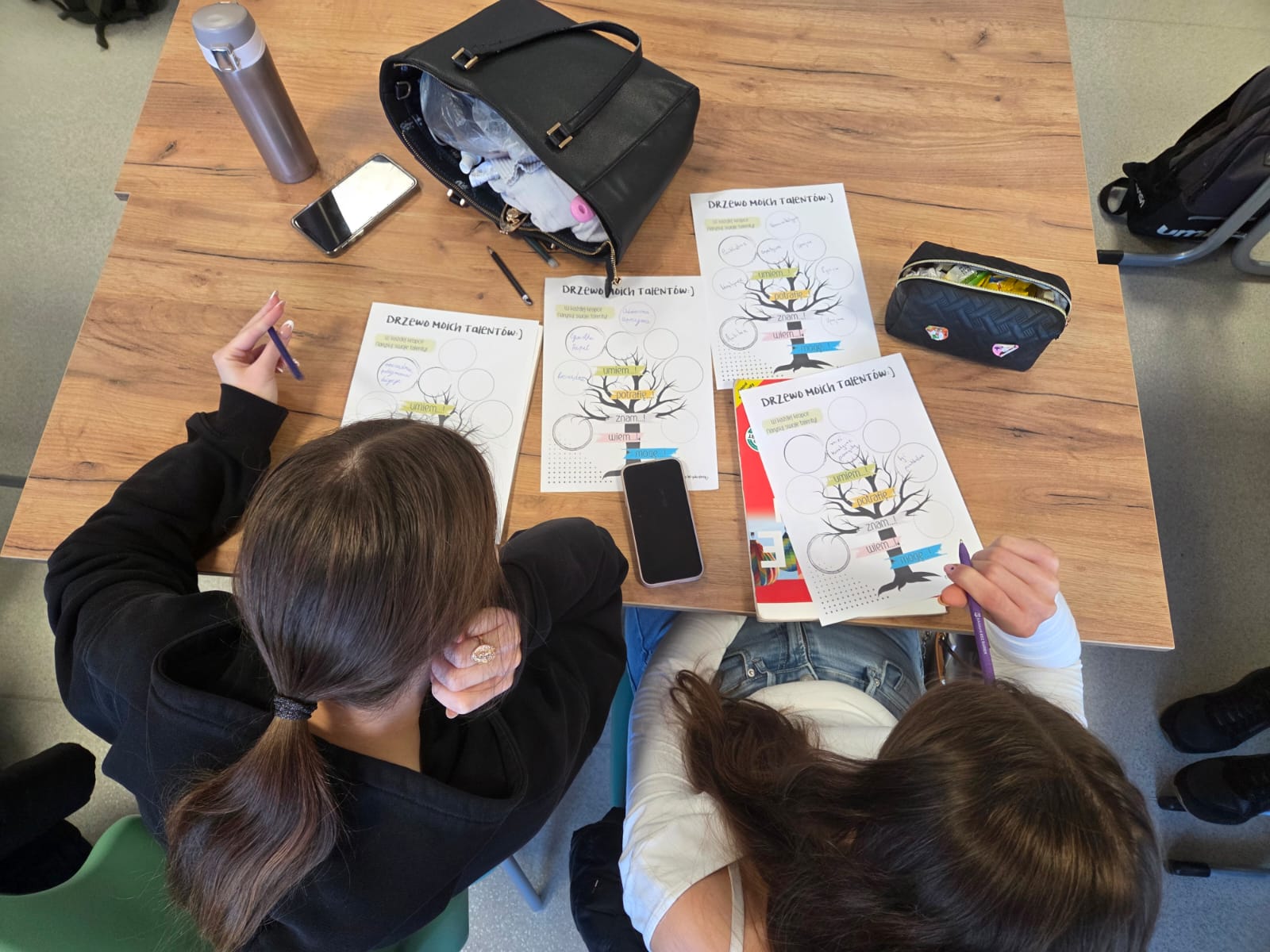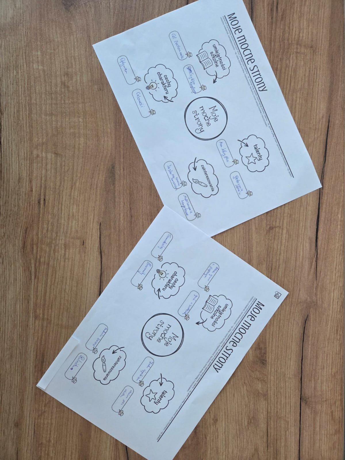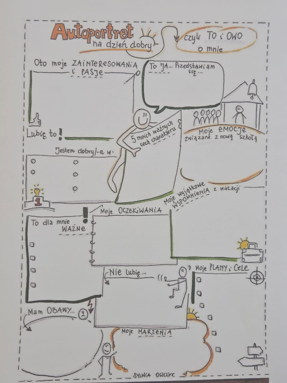 Na przygotowanych kartach i mapach myśli pojawiły się m.in. hasła dotyczące emocji związanych z nową szkołą, oczekiwań, marzeń, obaw, rzeczy ważnych i tych, których uczestnicy nie lubią. Pracowaliśmy także z obszarem wspomnień z wakacji, które pomagały budować pozytywne skojarzenia i poczucie bezpieczeństwa. Kolorowe rysunki, symbole i proste ilustracje pokazały, jak różnorodne są spojrzenia na siebie i własne doświadczenia.
