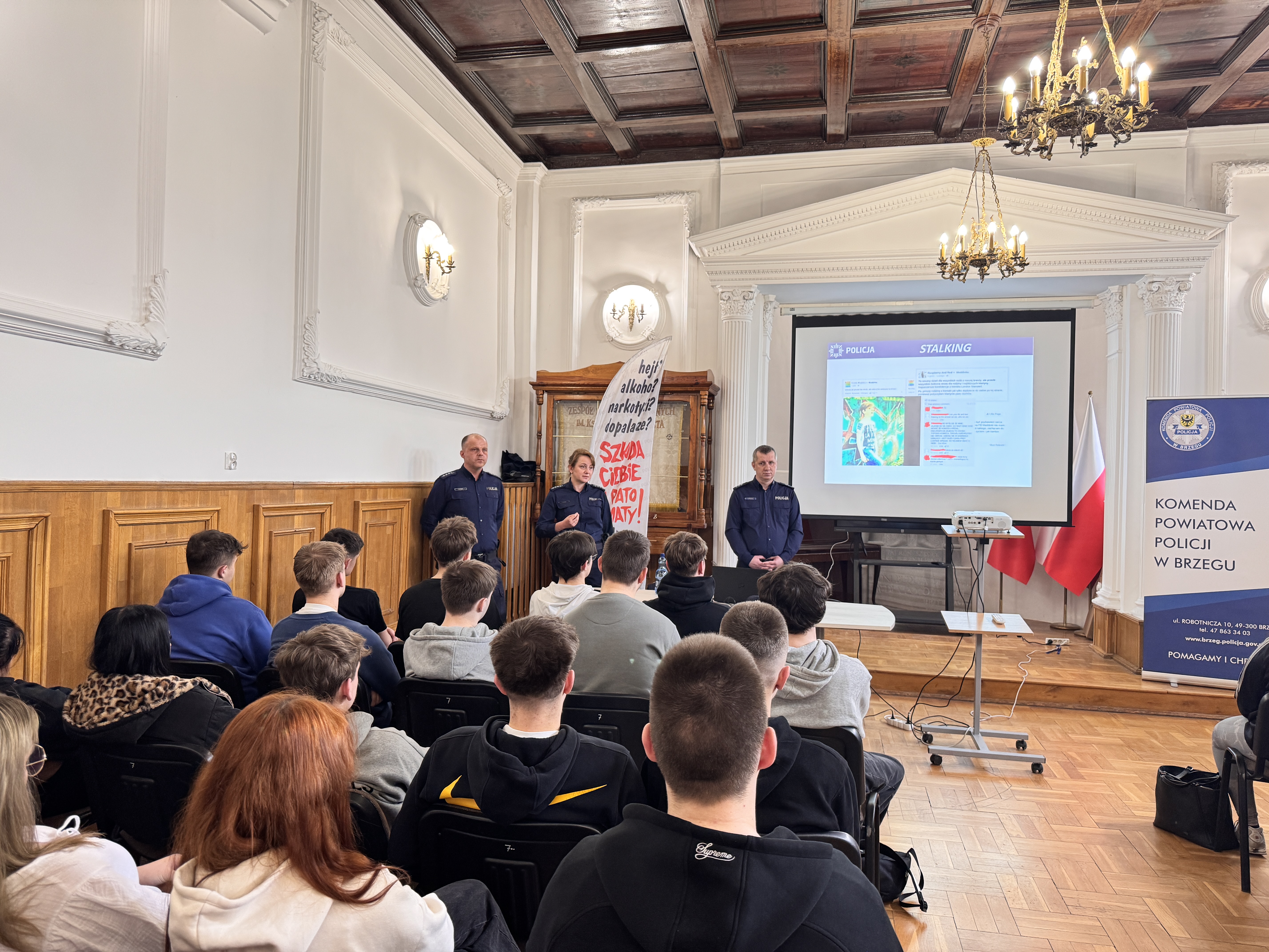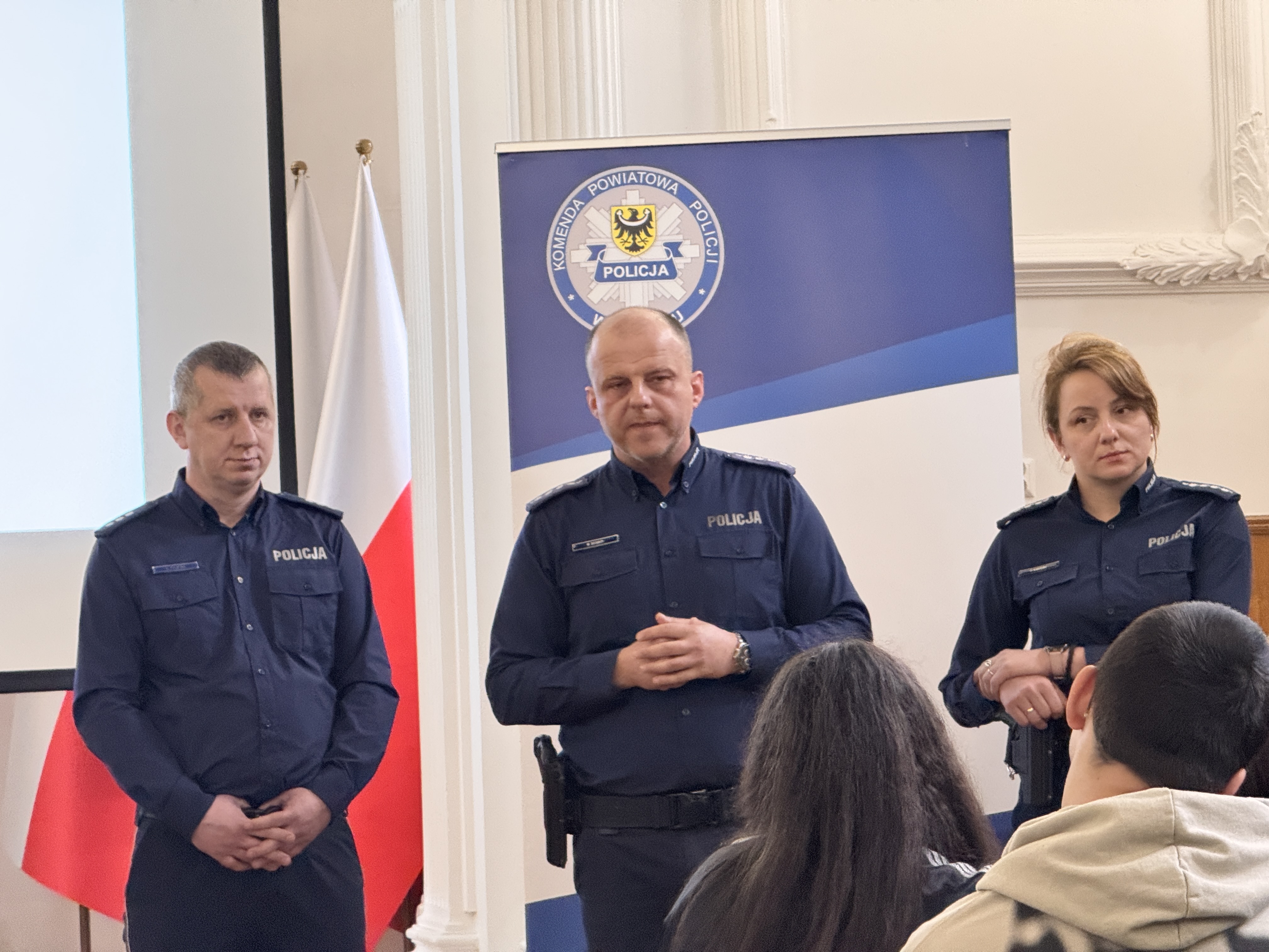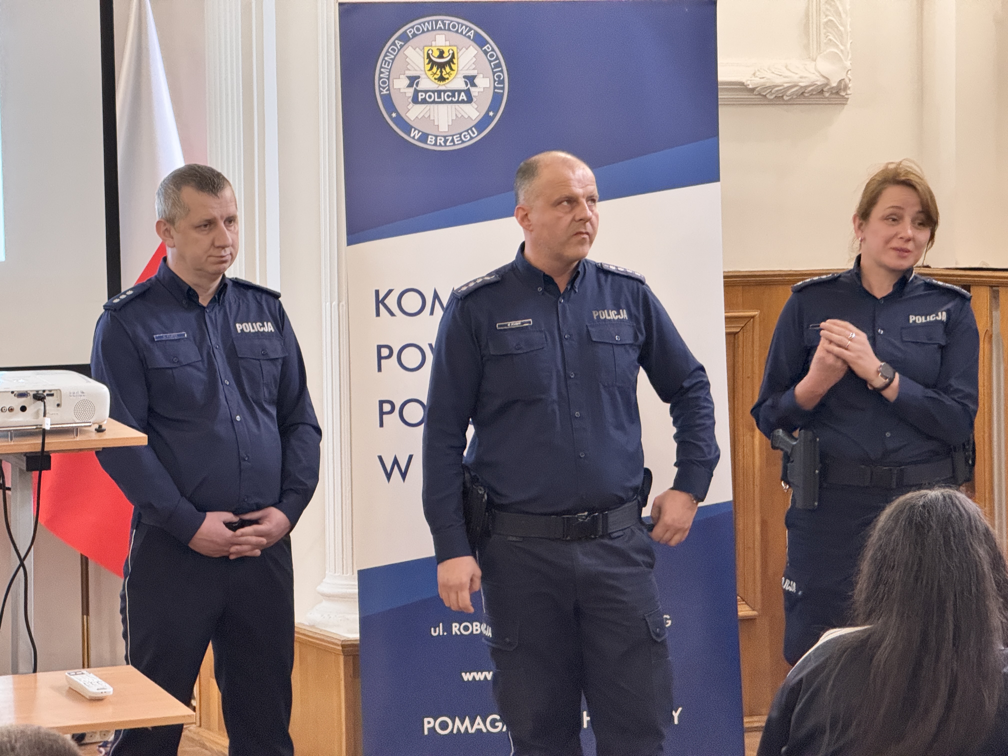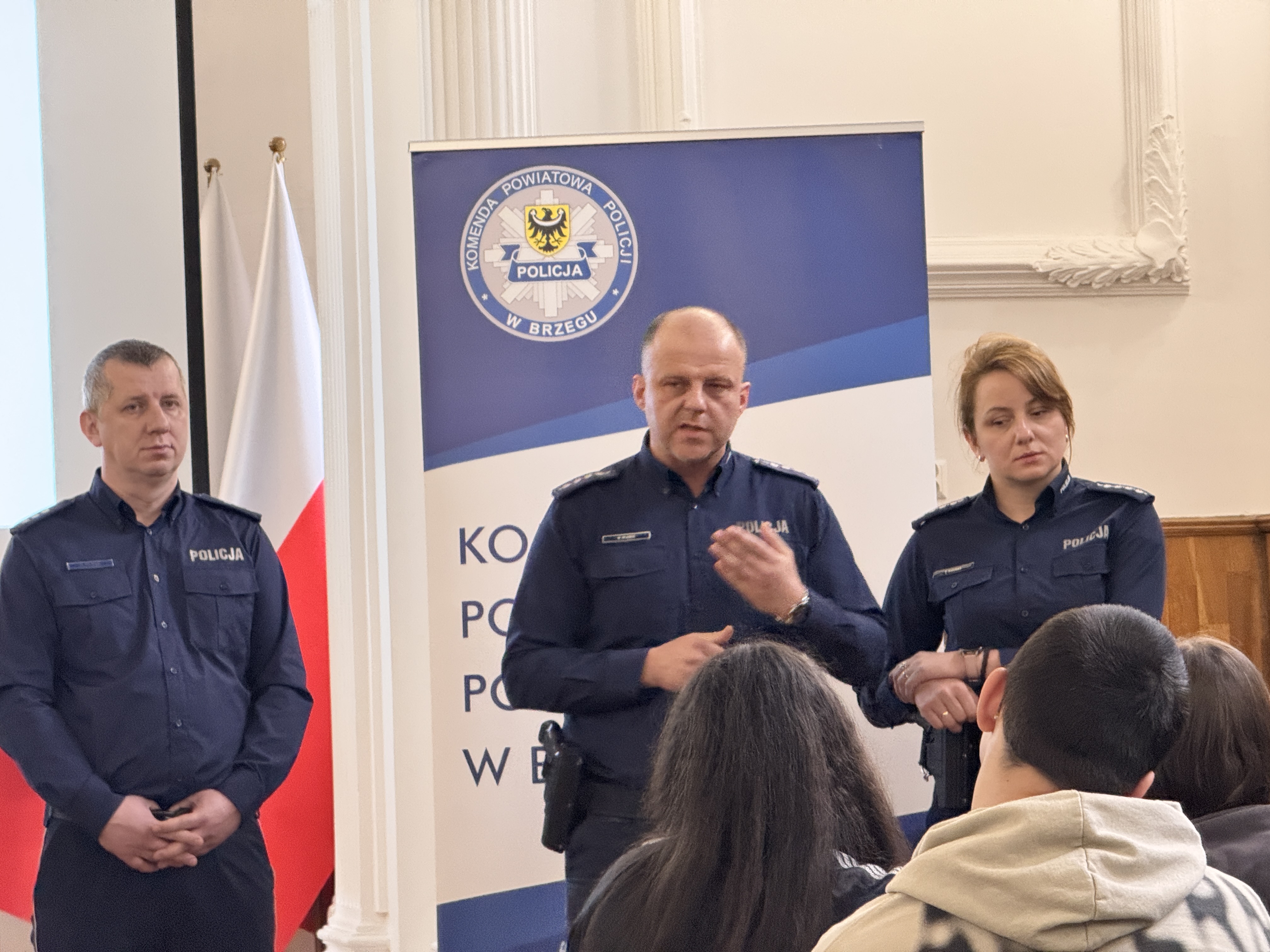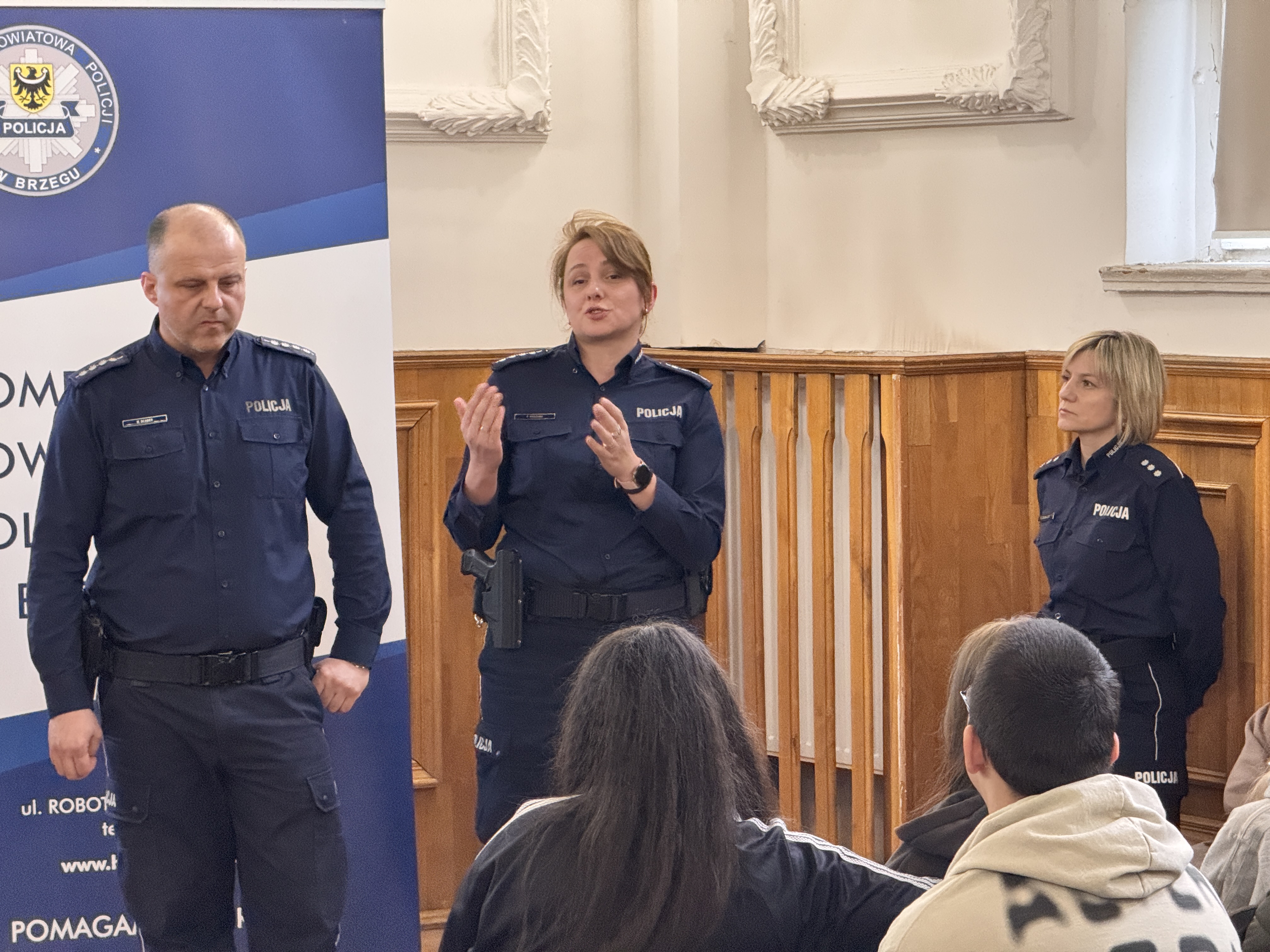 Tym razem spotkaliśmy się z policjantami z Komendy Powiatowej Policji w Brzegu. Wśród gości byli: p.o. Zastępcy Komendanta Powiatowego Policji kom. Aleksandra Czajka-Luty, nadkom. Grzegorz Filipek z Wydziału Kryminalnego, asp. szt. Michał Scąber oraz asp. sztab. Patrycja Kaszuba. W imieniu Pani Dyrektor przywitała ich wicedyrektor Synbilla Wojciechowska.