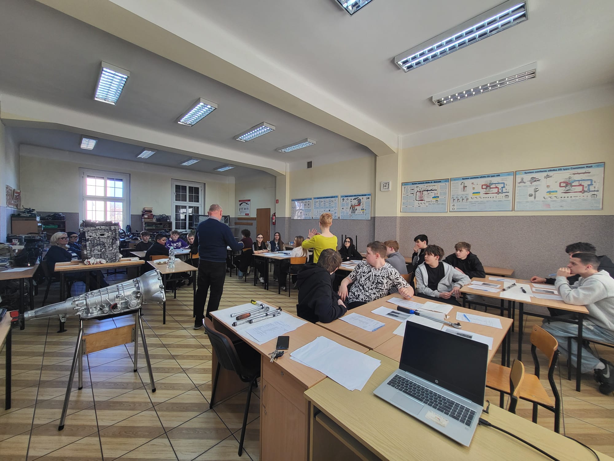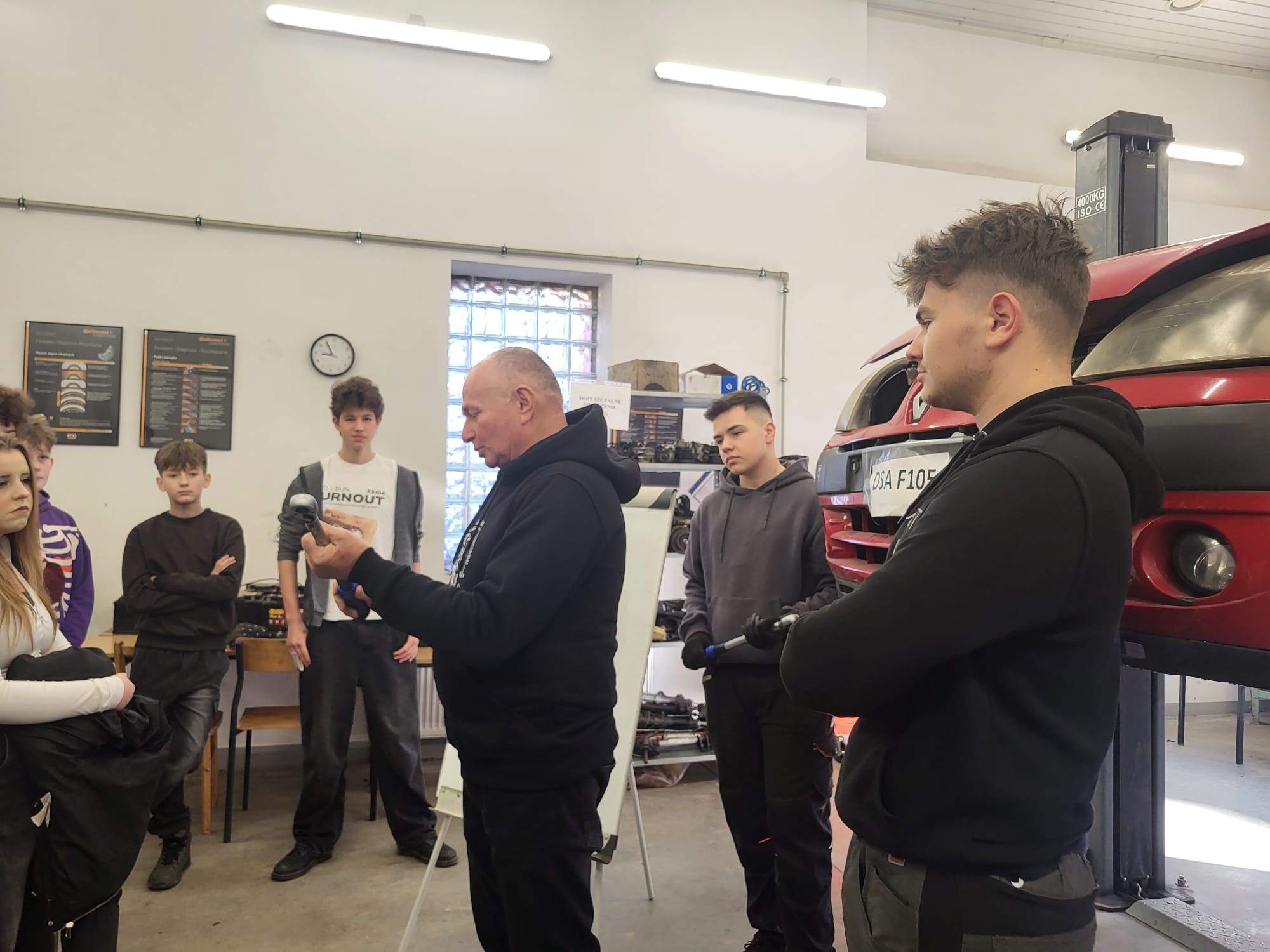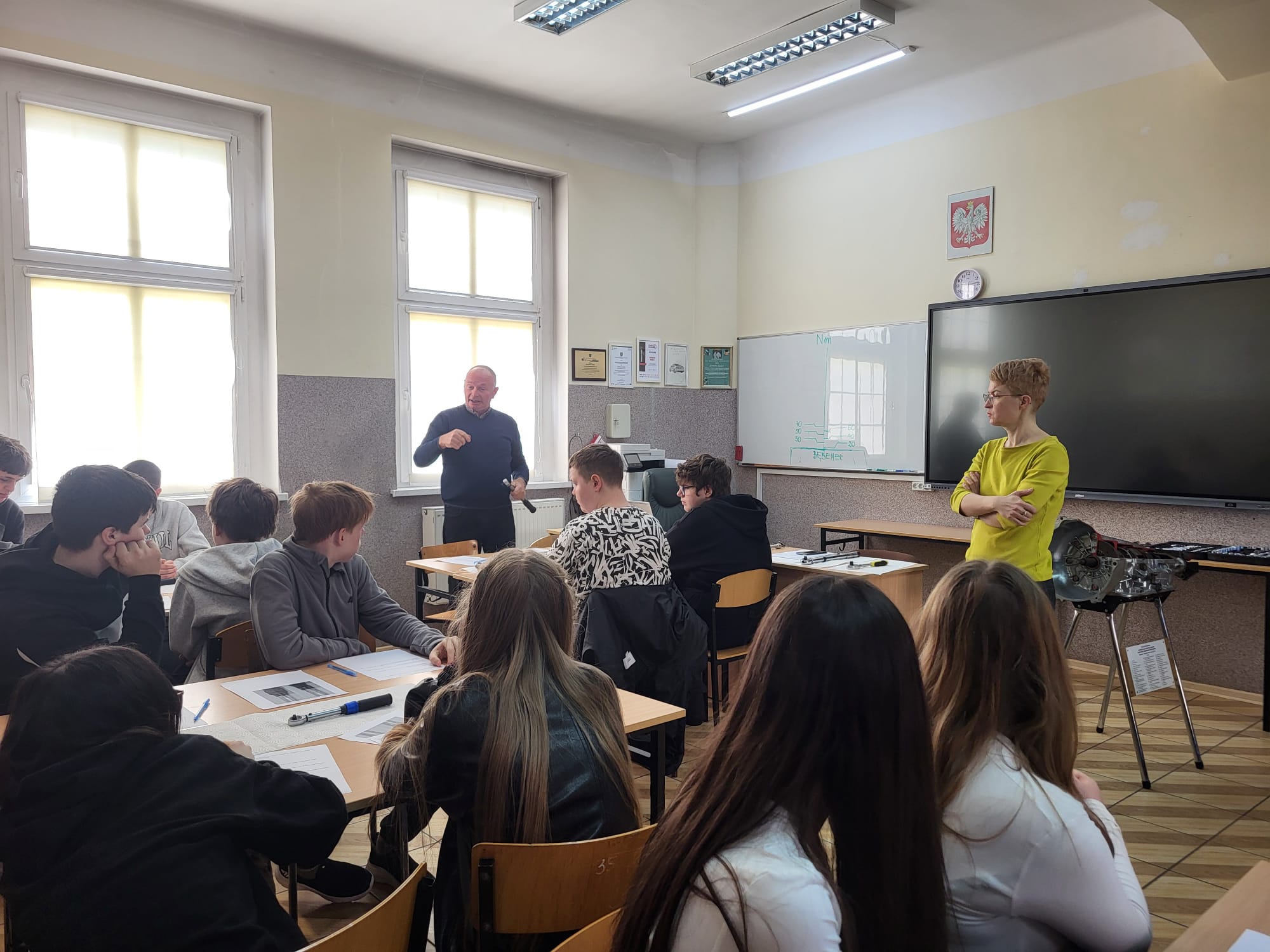 Roman Zięba przekazywał informacje w języku polskim a Anna Kielian w języku angielskim. W pracowni samochodowej i w sali lekcyjnej nasi goście dowiedzieli się w praktyce m.in. czym jest moment siły, Nm i co kryje się pod wzorem M=F x r a także co należy zrobić aby połączenie śrubowe było właściwe.