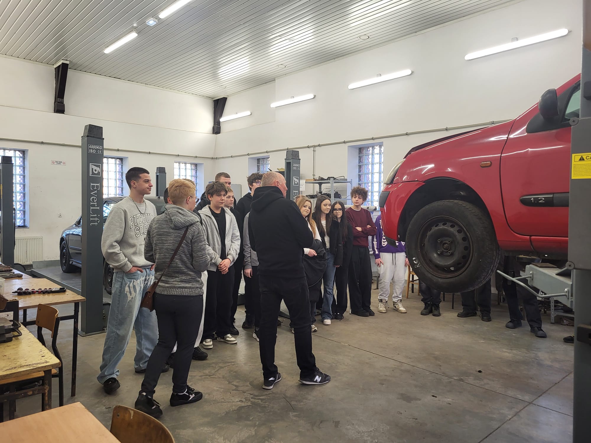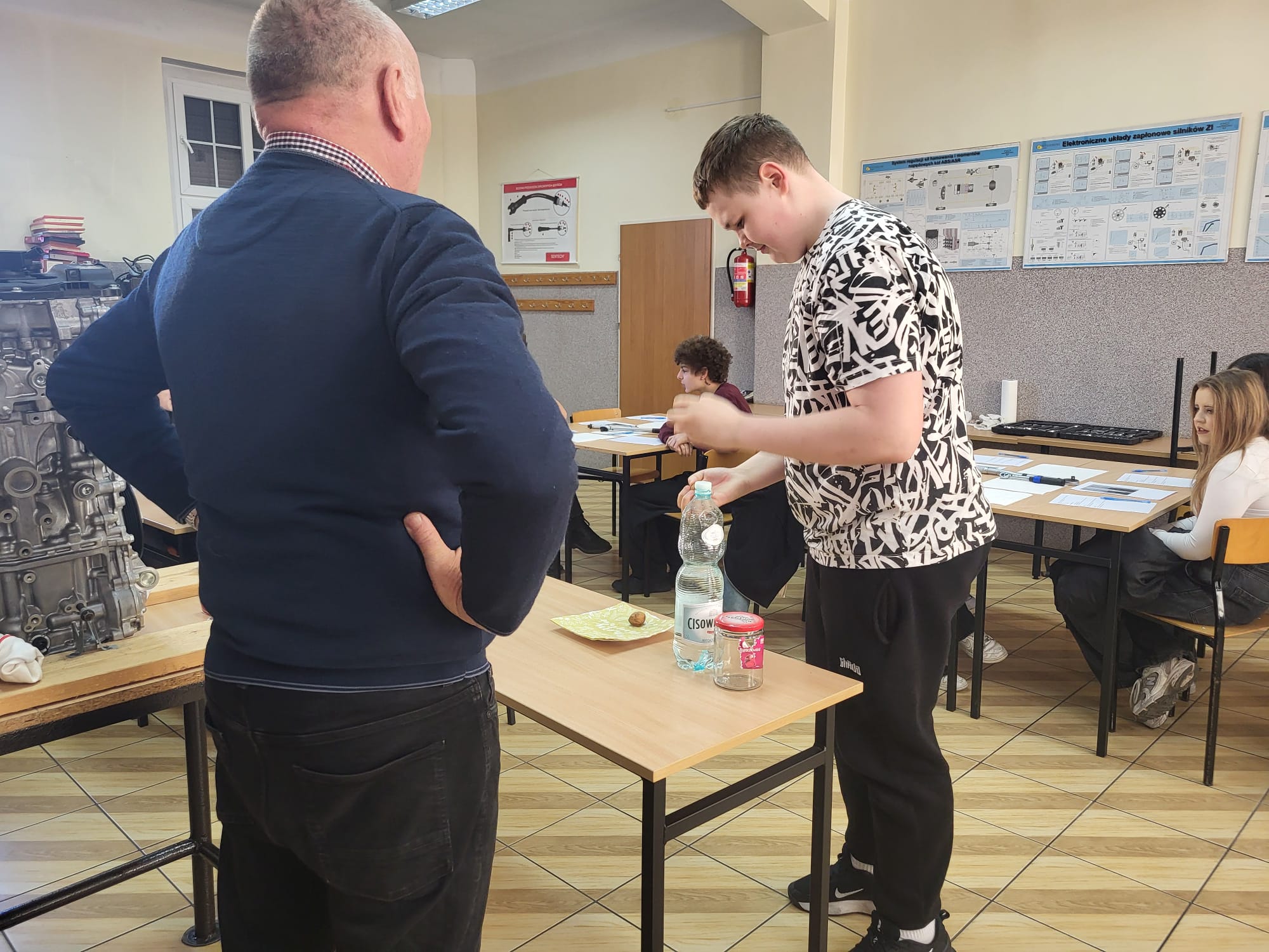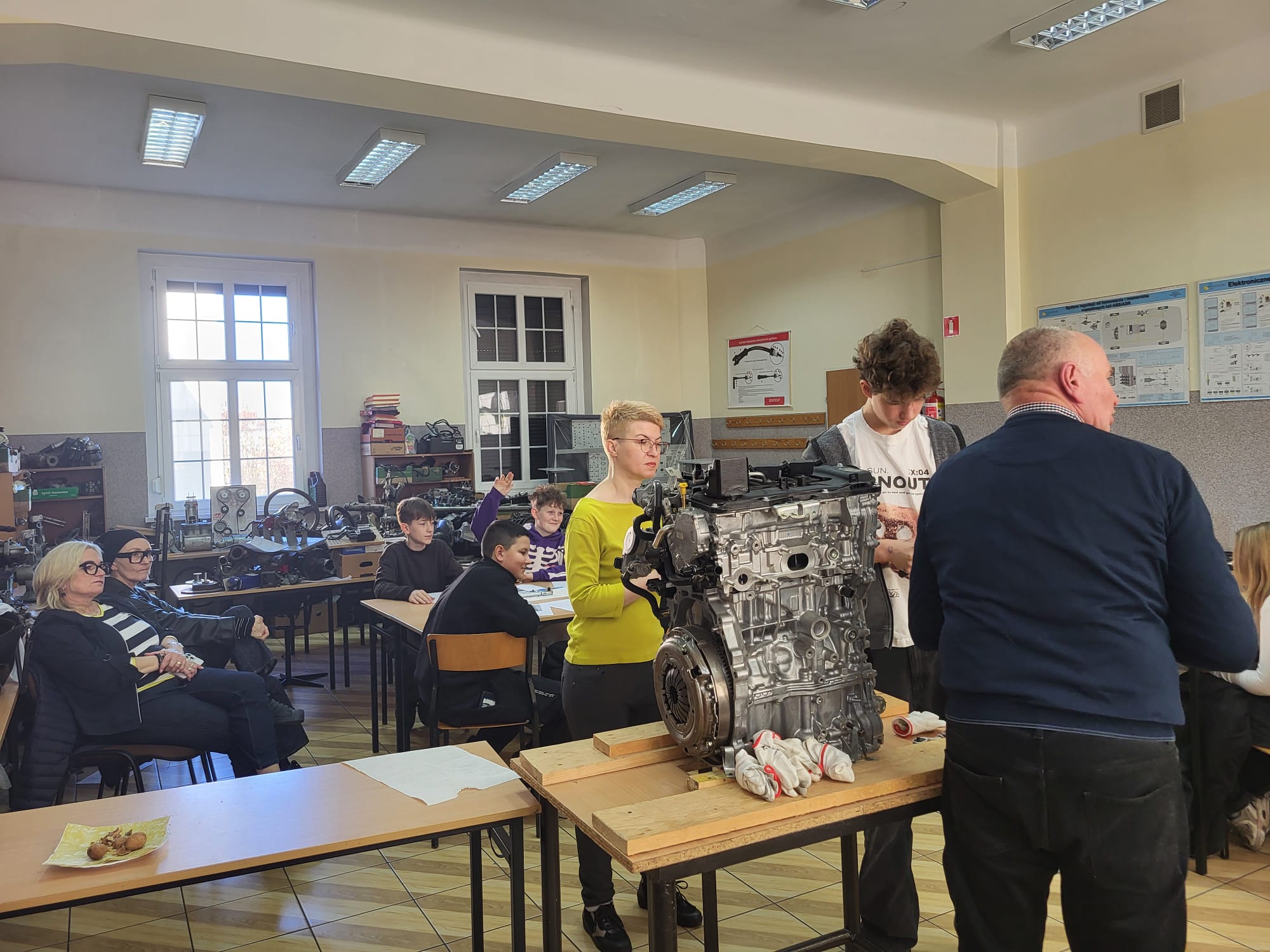 Roman Zięba przekazywał informacje w języku polskim a Anna Kielian w języku angielskim. W pracowni samochodowej i w sali lekcyjnej nasi goście dowiedzieli się w praktyce m.in. czym jest moment siły, Nm i co kryje się pod wzorem M=F x r a także co należy zrobić aby połączenie śrubowe było właściwe.