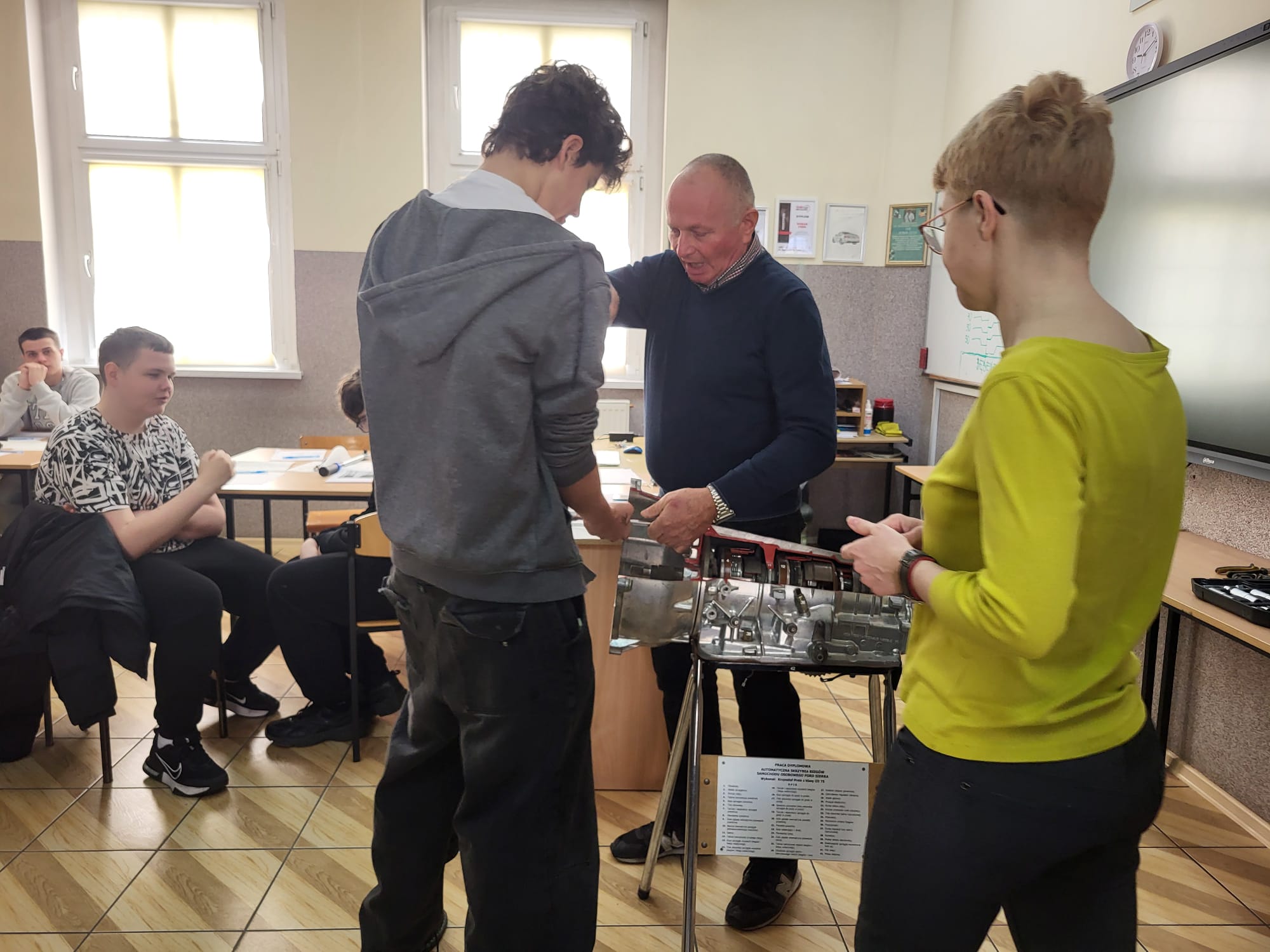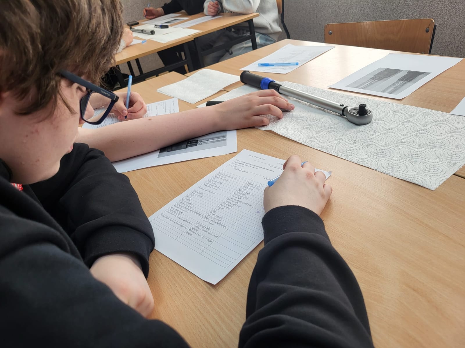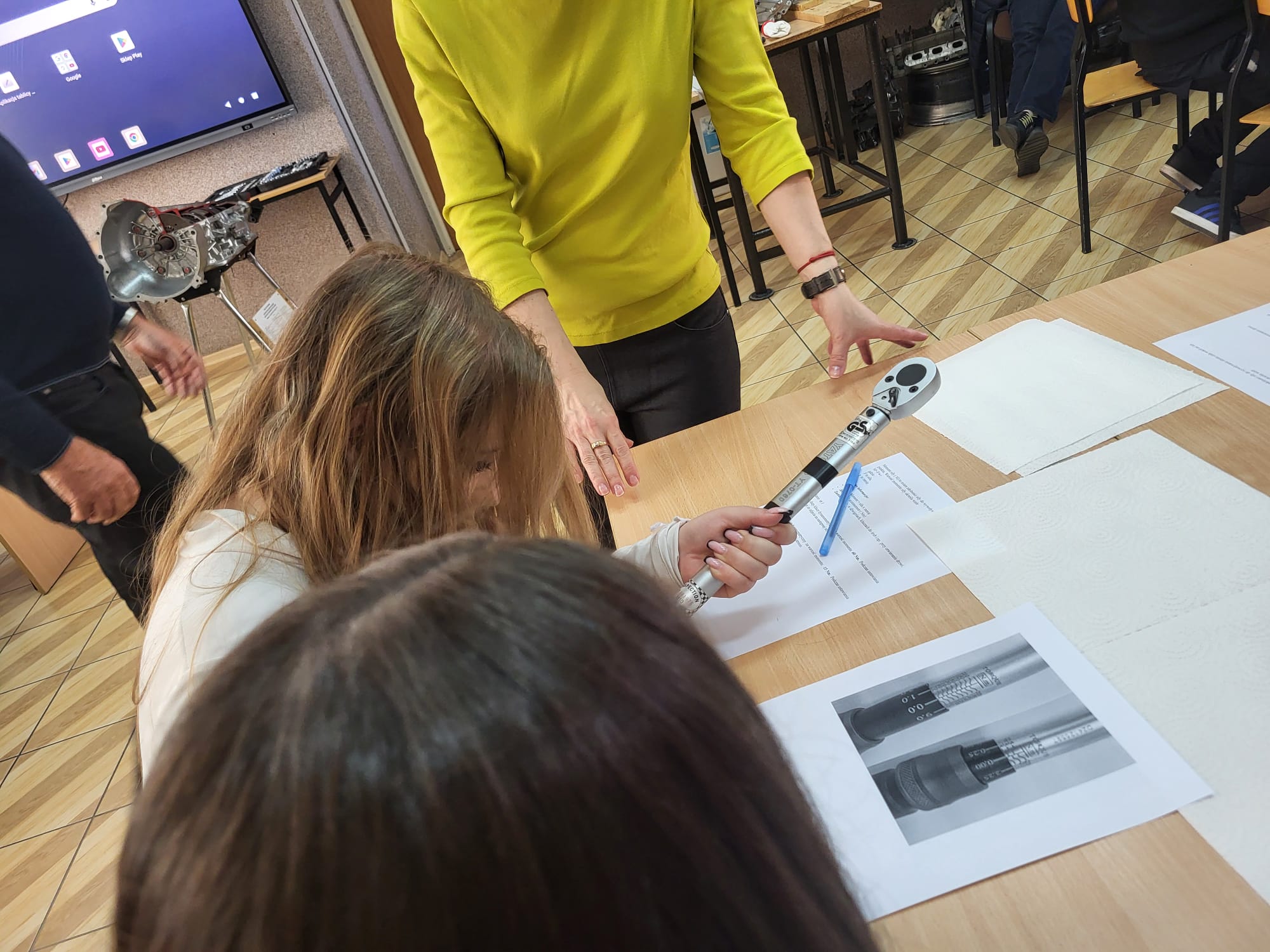 Bardzo aktywnie na małych i dużych kluczach dynamometrycznych ustawiali zadane wartości momentów dokręcania połączeń śrubowych a następnie praktyczne m.in. na silniku hybrydowym Toyoty oraz na półautomatycznej skrzyni biegów dokręcali połączenia. Każdy z uczniów otrzymał zestaw towarzyszących materiałów sporządzonych w języku polskim i angielskim.