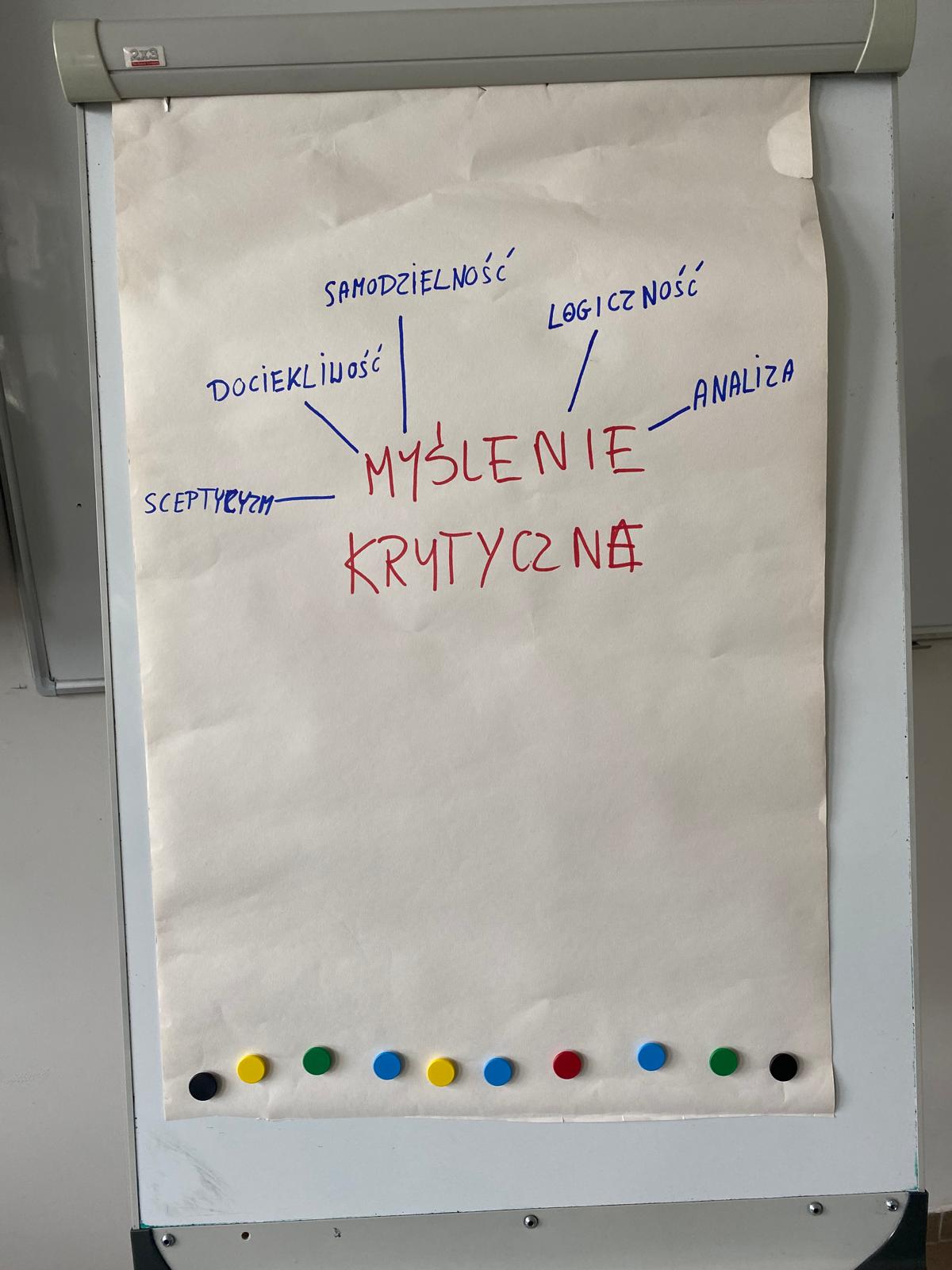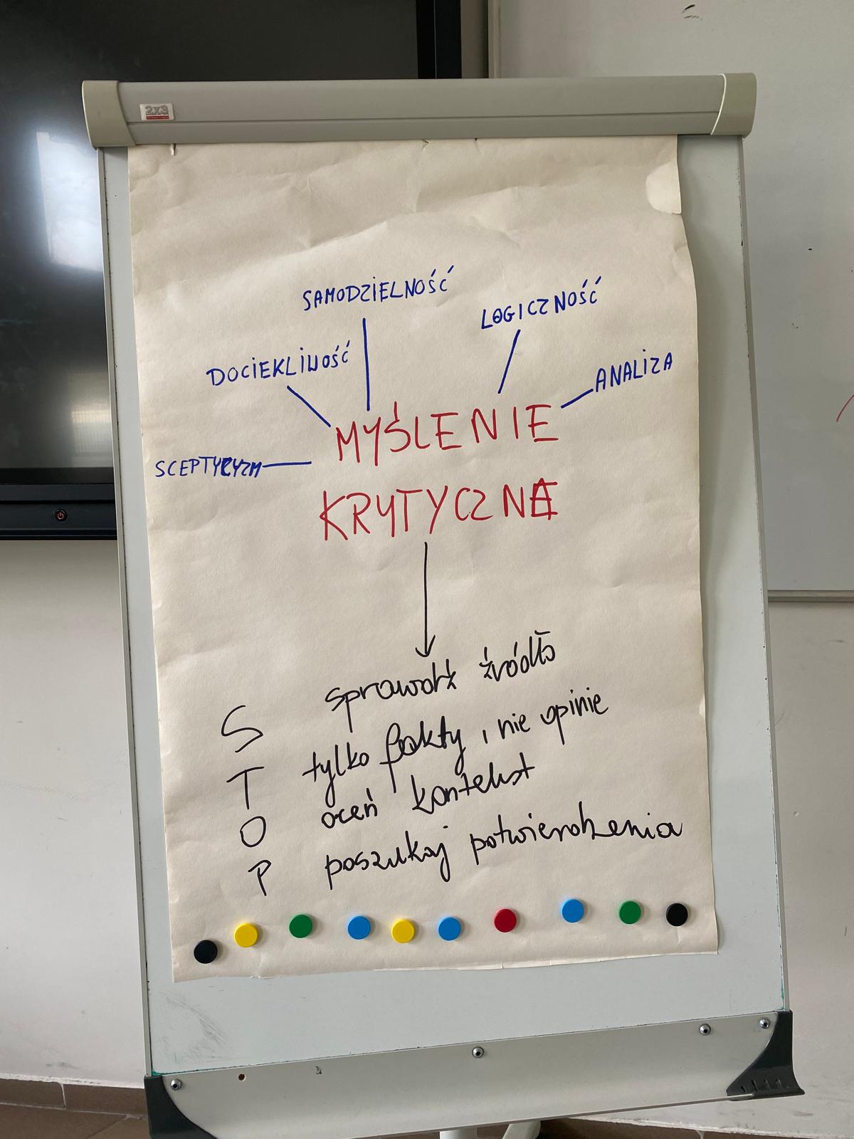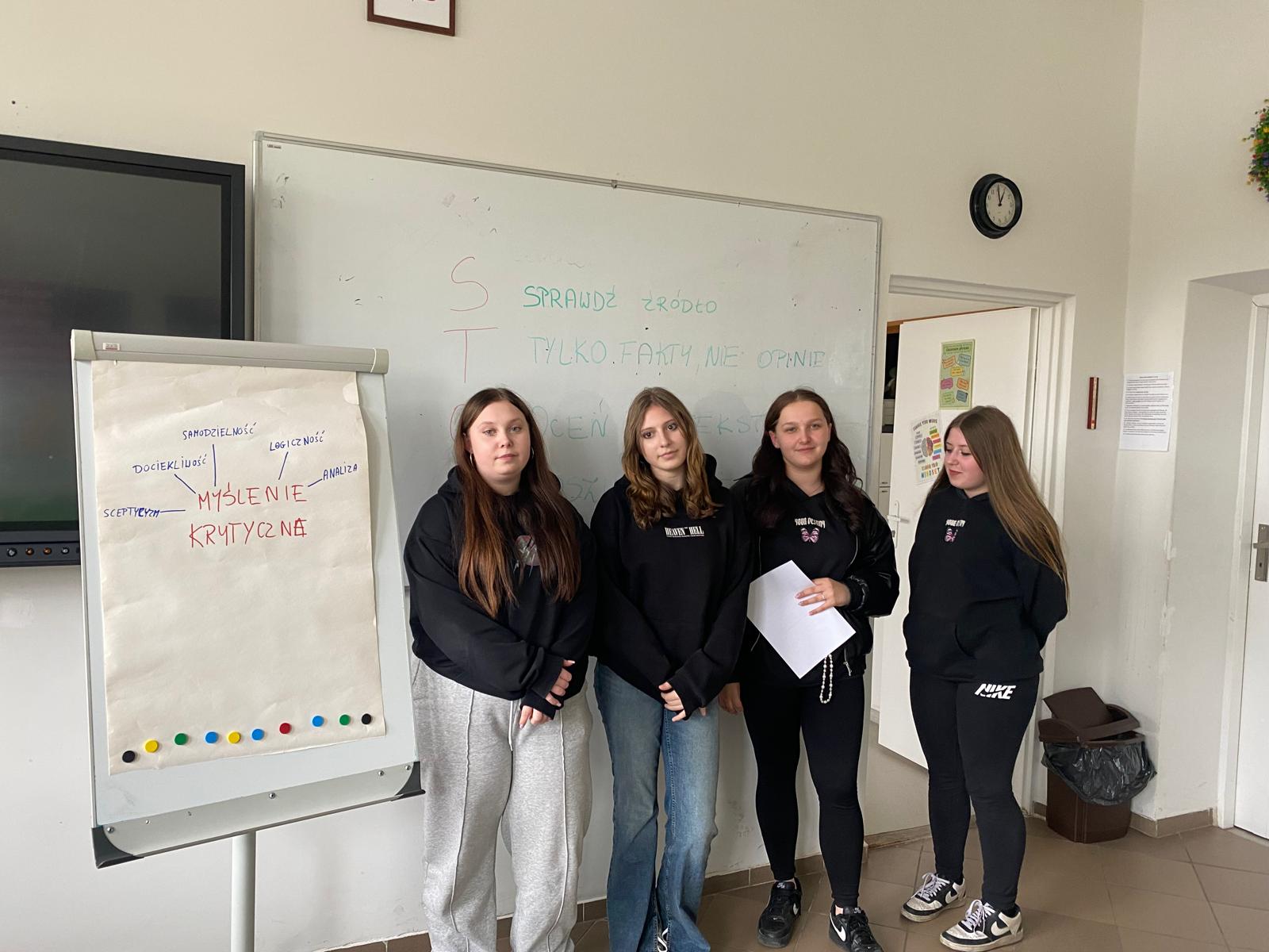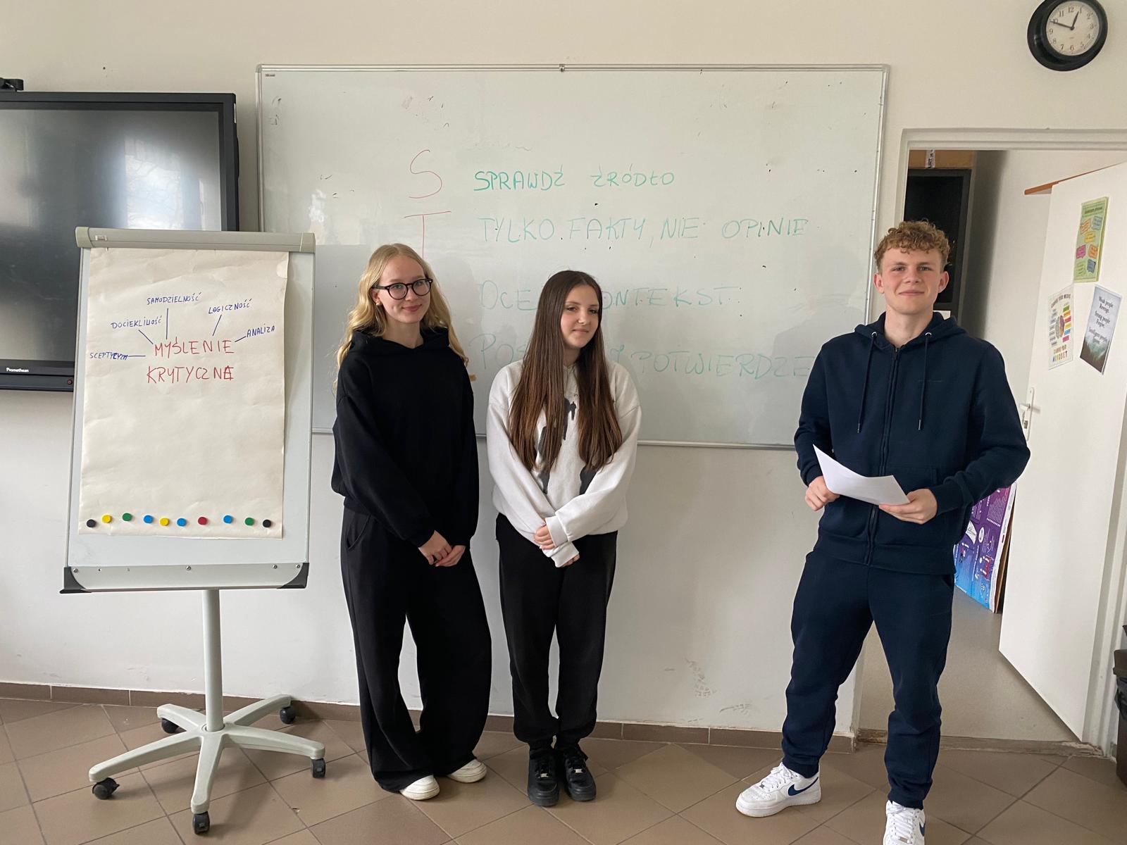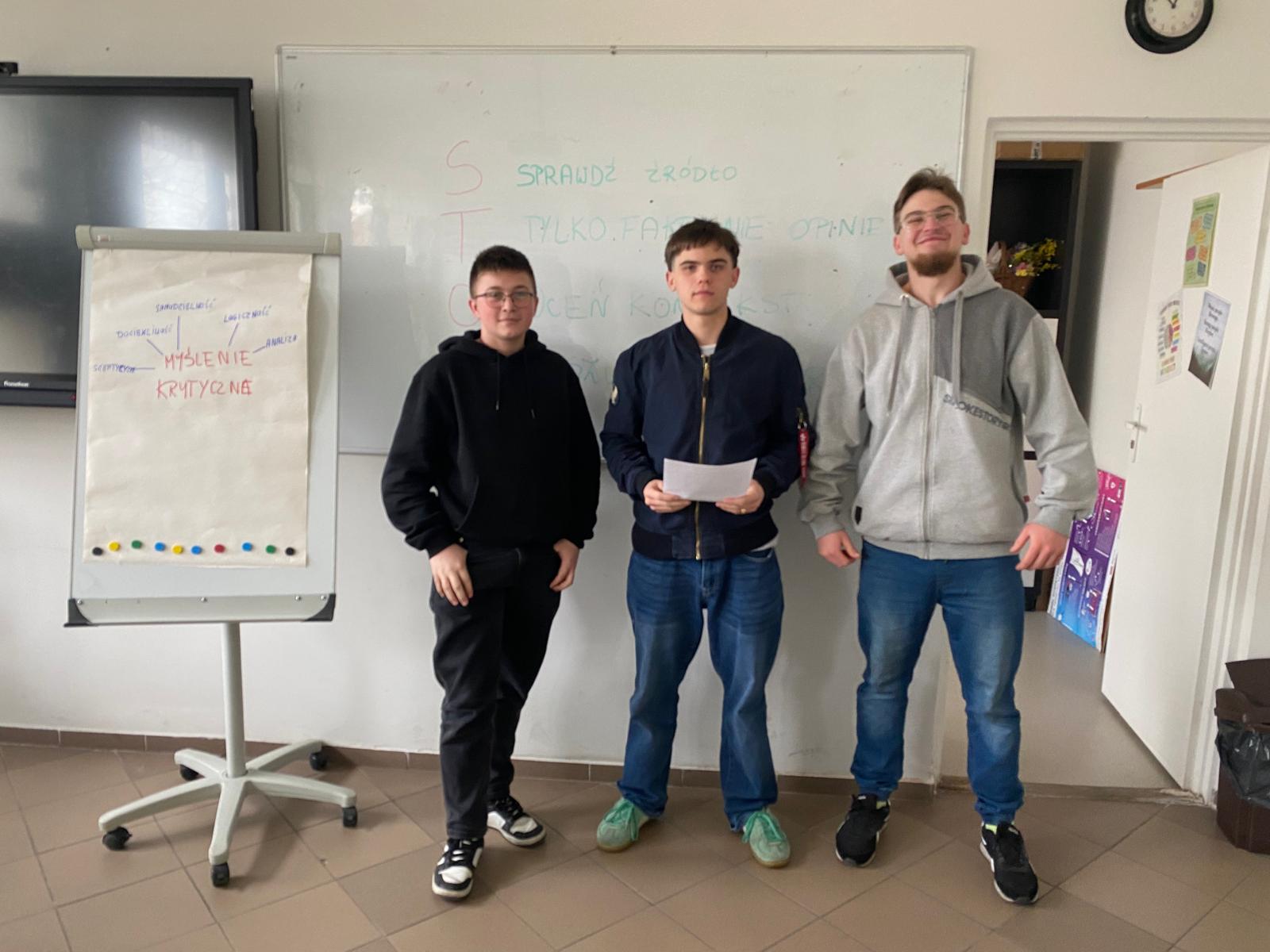 Na ostatnich zajęciach uczniowie naprawdę dali czadu! W grupach zgłębiali temat krytycznego myślenia – rozmawiali, zadawali pytania, czasem się nawet trochę spierali, żeby dojść do sedna: czym jest informacja, czym dezinformacja, a czym fake news? I jak nie dać się złapać w pułapki w sieci.