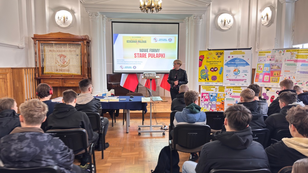 My staramy się z tym walczyć, między innymi zapraszając ekspertów. Jak co roku gościliśmy Panią Katarzynę Gawlak, Starszego Asystenta Sekcji Promocji Zdrowia i Oświaty Zdrowotnej z PSSE w Brzegu. Co jakiś czas organizujemy spotkania i rozmowy na temat szkodliwości palenia — tak też było z okazji Światowego Dnia Rzucania Palenia. Uczniowie klas 1 TPS, 3E, 3ML i 1B wzięli udział w spotkaniu, podczas którego omawialiśmy skutki palenia papierosów i e-papierosów.