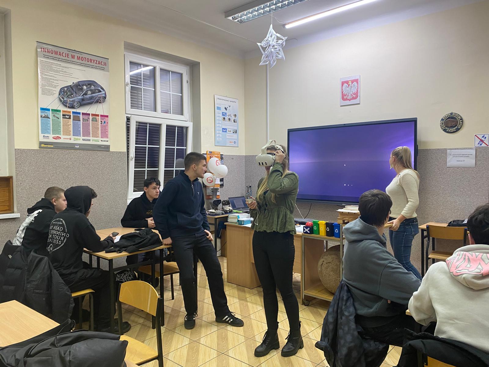Uczniowie klasy 3 B wzięli udział w zajęciach „Świat zawodów w wirtualnej rzeczywistości”, podczas których poznawali różne ścieżki kariery w zupełnie nowy, niezwykle angażujący sposób. Dzięki wykorzystaniu gogli VR mogli dosłownie „wejść” w wybrane zawody i sprawdzić, jak wyglądają one od środka.