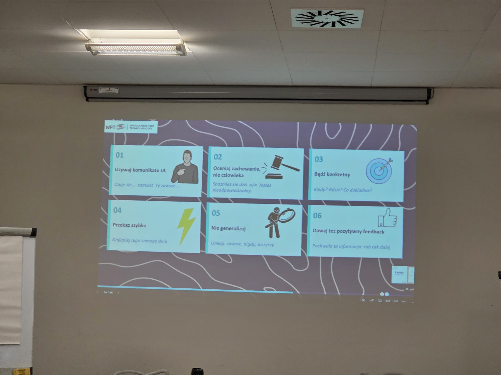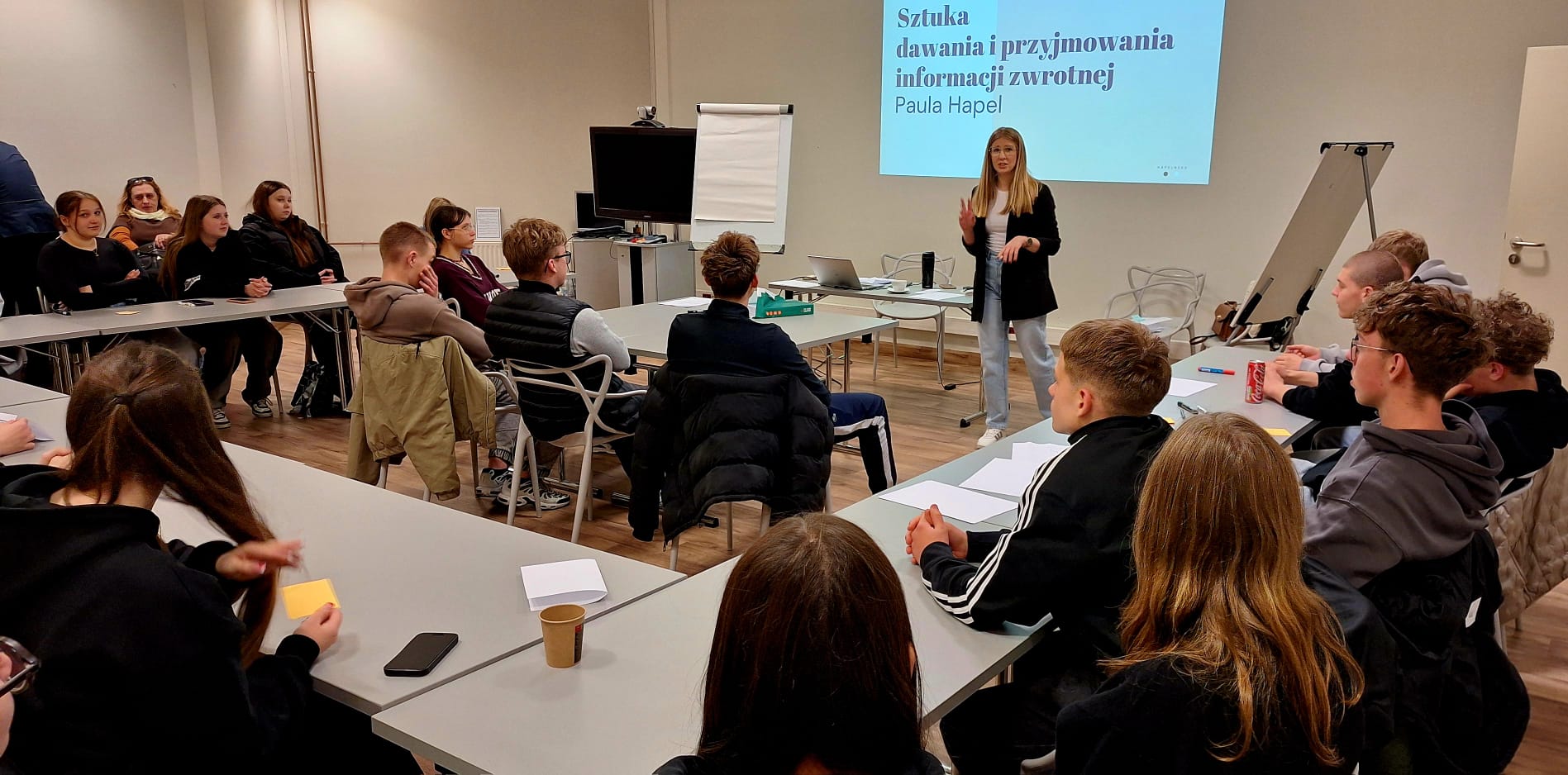 Istotnym elementem warsztatów była również tematyka komunikacji interpersonalnej, a w szczególności sztuka udzielania i przyjmowania informacji zwrotnej. Uczniowie przekonali się, jak ważne są właściwe relacje, umiejętność wyrażania opinii oraz otwartość na konstruktywną krytykę zarówno w życiu zawodowym, jak i codziennym.