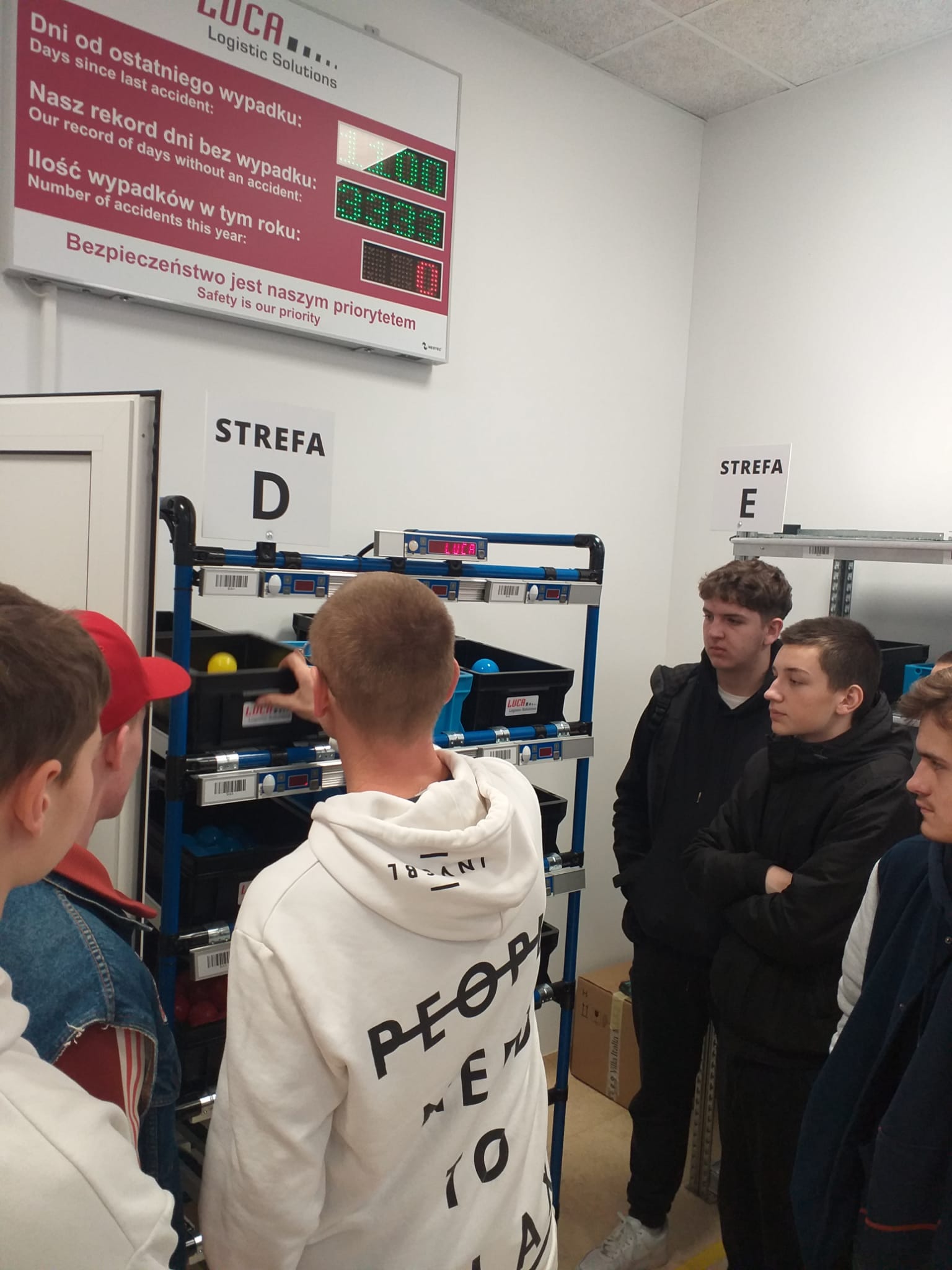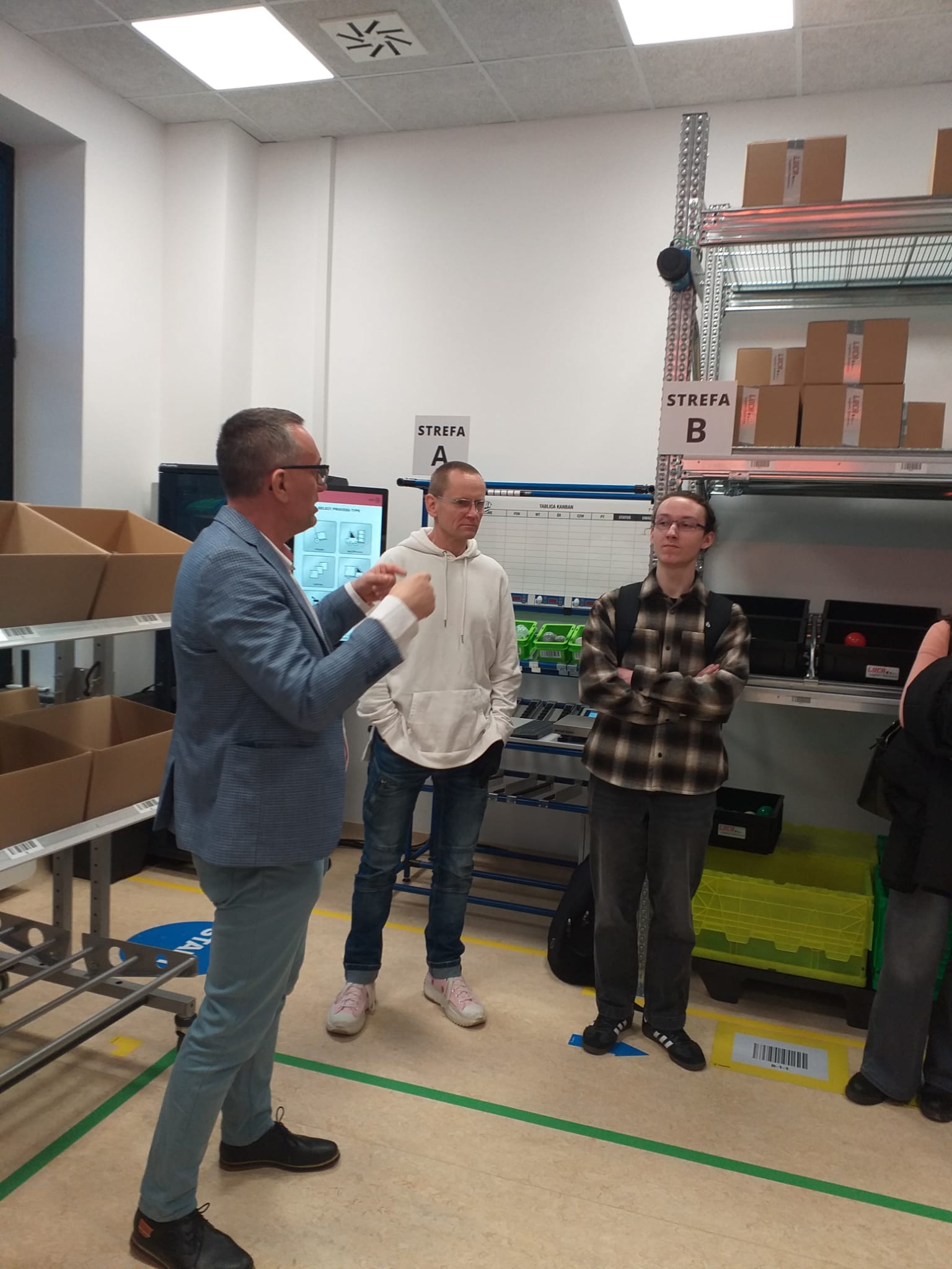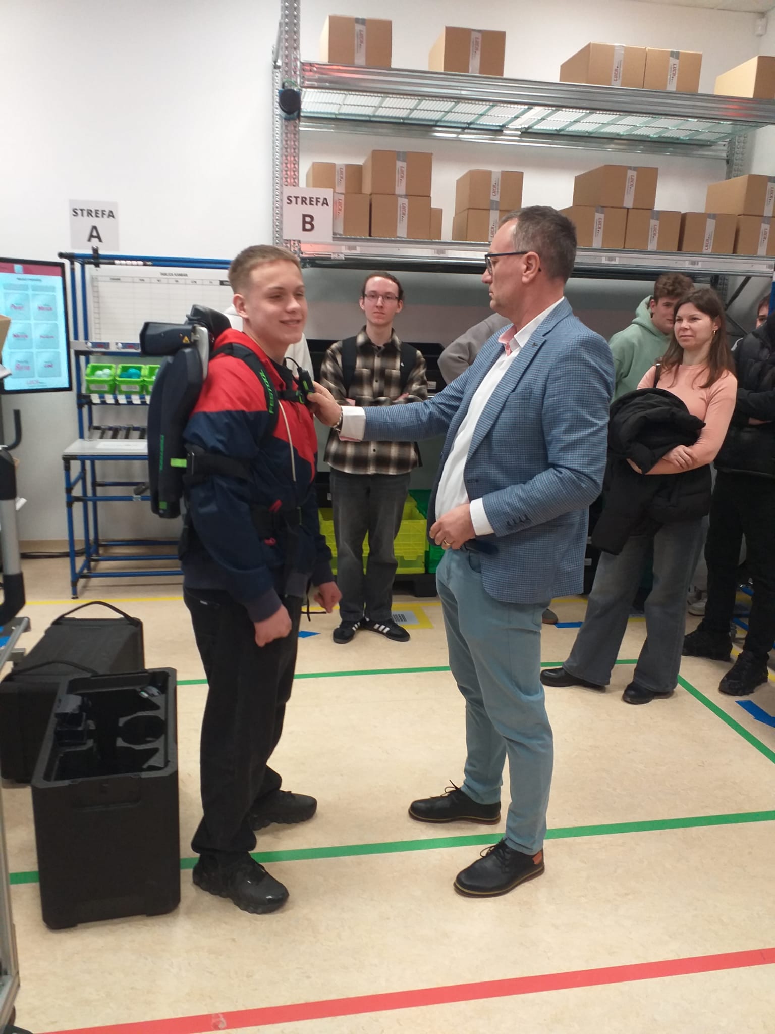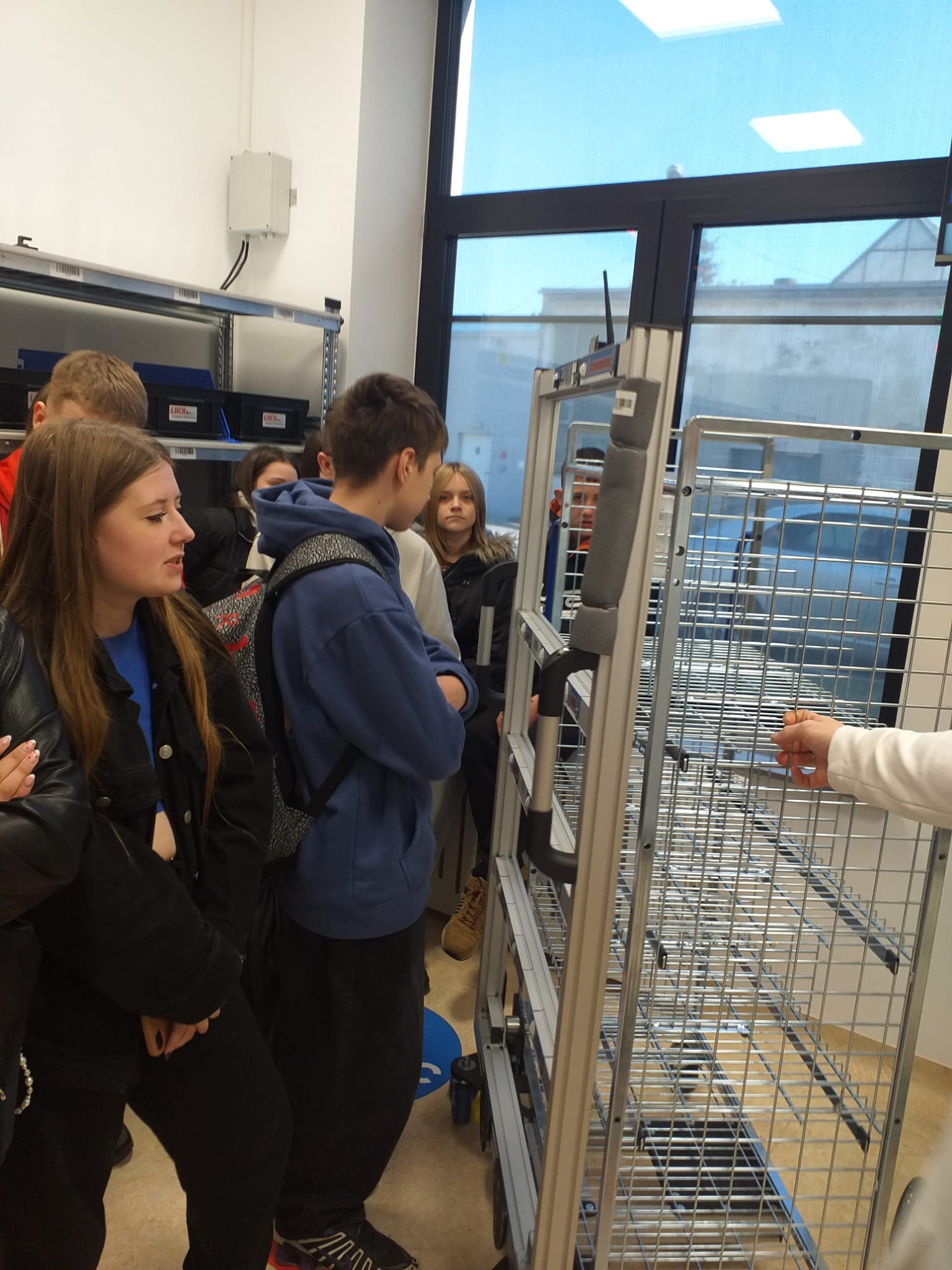 Kolejnym punktem wycieczki było BCU w Grodkowie. Tam uczniów przyjął kierownik Roman Kępiński, który zaprezentował nowoczesny magazyn szkoleniowy. Młodzież mogła zobaczyć i wypróbować różne rozwiązania stosowane w logistyce – regały magazynowe, czytniki, systemy wspierające pracę magazynu, wózki transportowe, a nawet egzoszkielet ułatwiający pracę magazyniera. To było praktyczne spojrzenie na nowoczesne technologie, które coraz częściej wspierają branżę logistyczną.