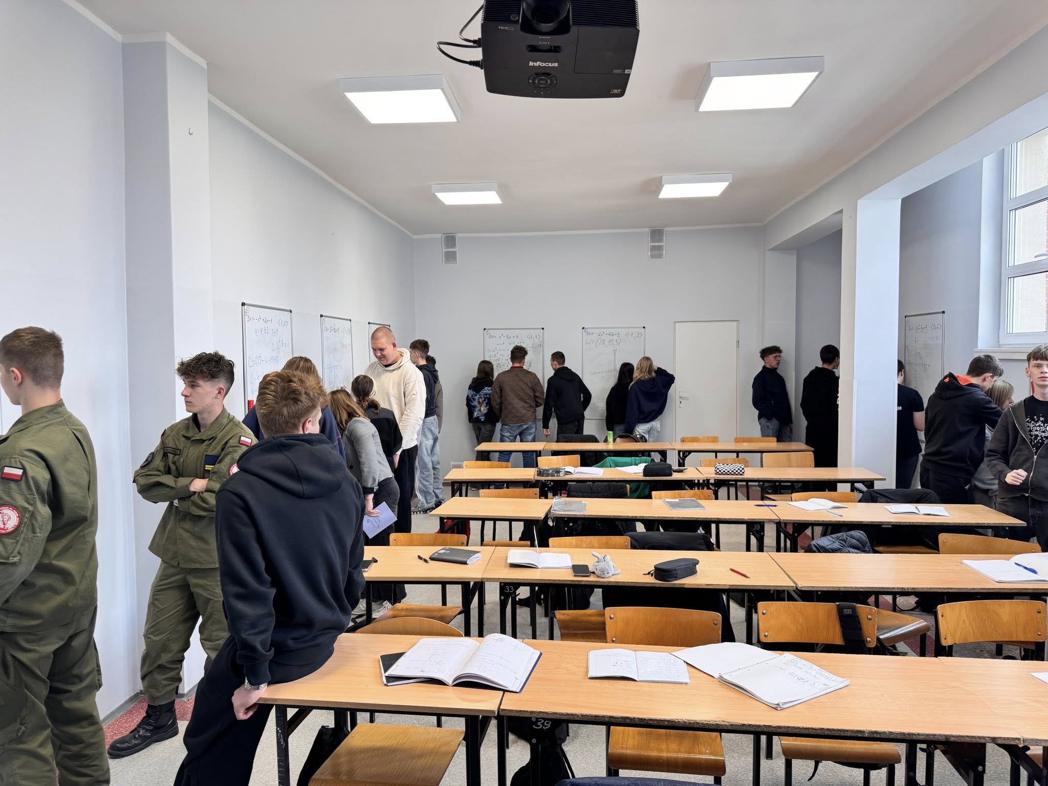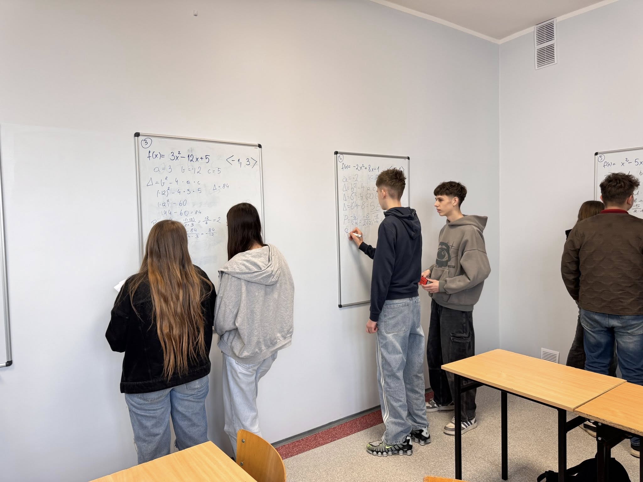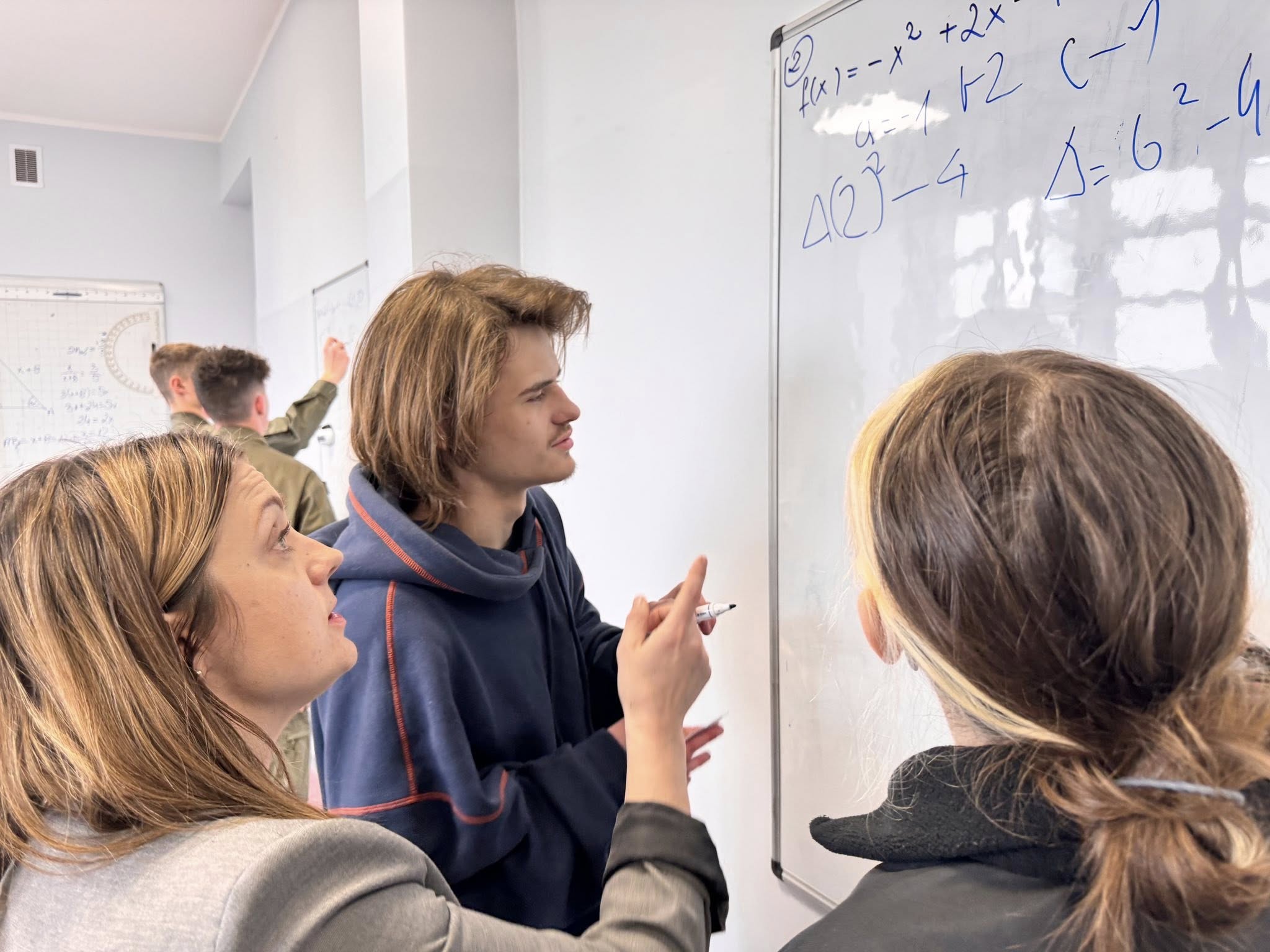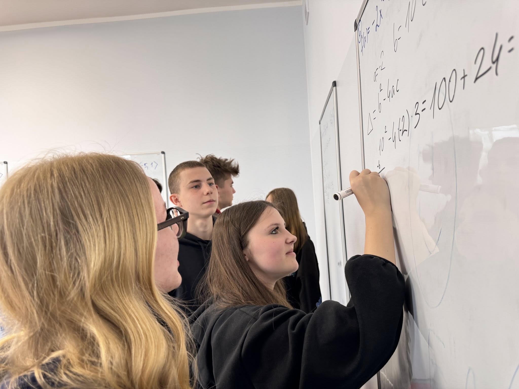 Zajęcia odbywają się w nietypowej formie, uczniowie pracują w grupach przy tablicach, a nie w tradycyjnych ławkach. Dzięki temu mogą swobodnie wymieniać się pomysłami, wspólnie analizować zadania i uczyć się poprzez działanie.