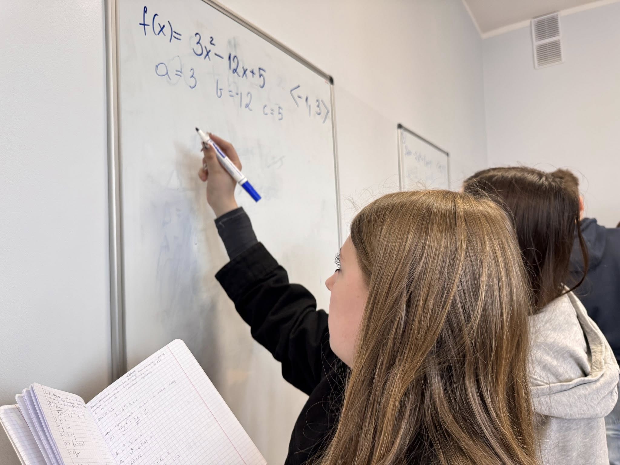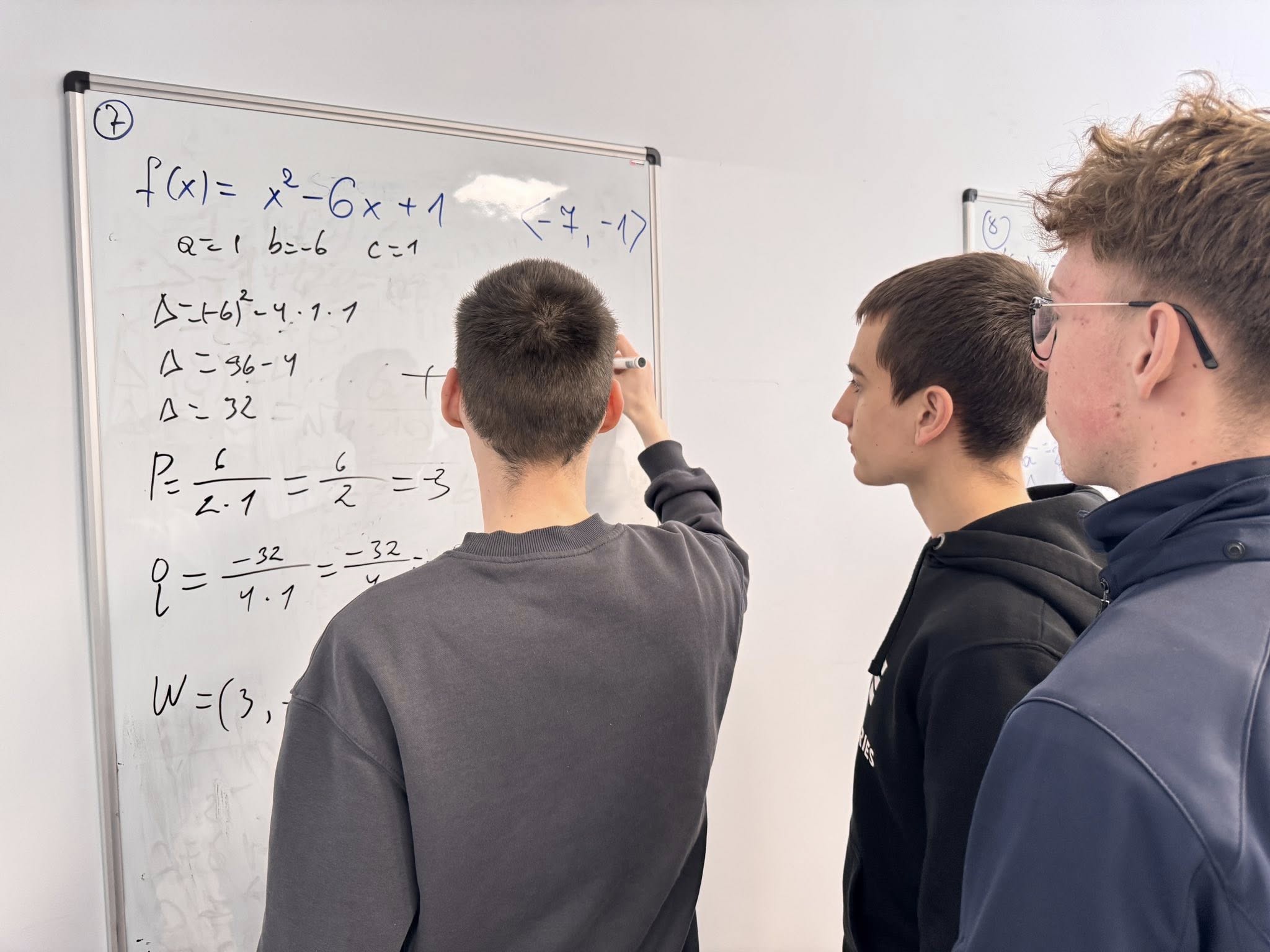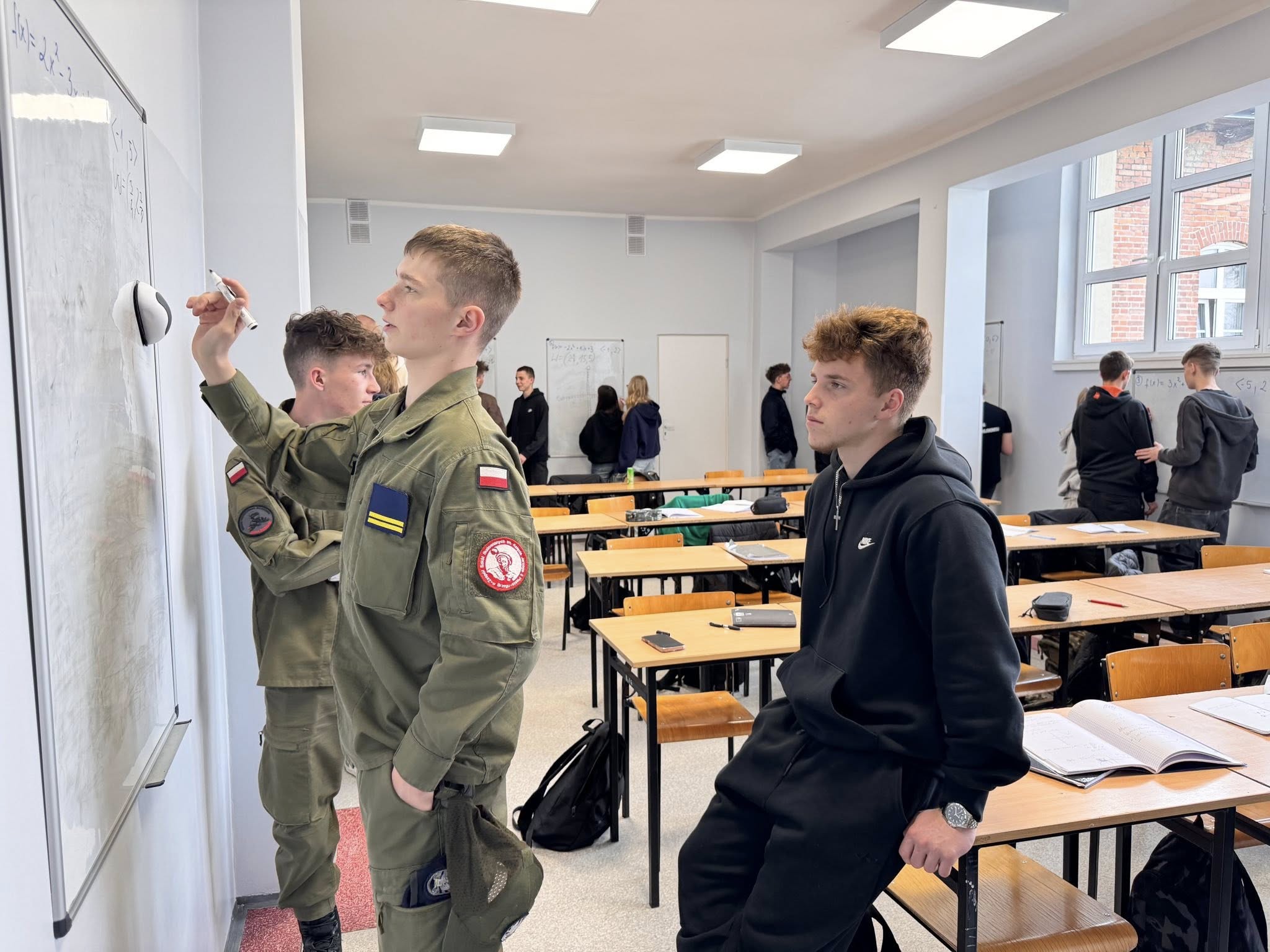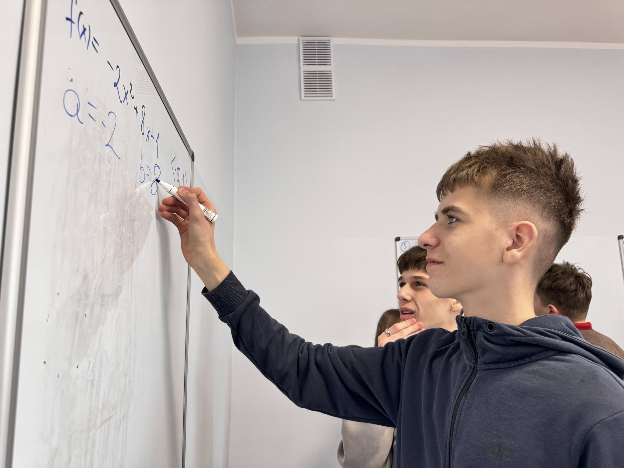 Zajęcia odbywają się w nietypowej formie, uczniowie pracują w grupach przy tablicach, a nie w tradycyjnych ławkach. Dzięki temu mogą swobodnie wymieniać się pomysłami, wspólnie analizować zadania i uczyć się poprzez działanie.