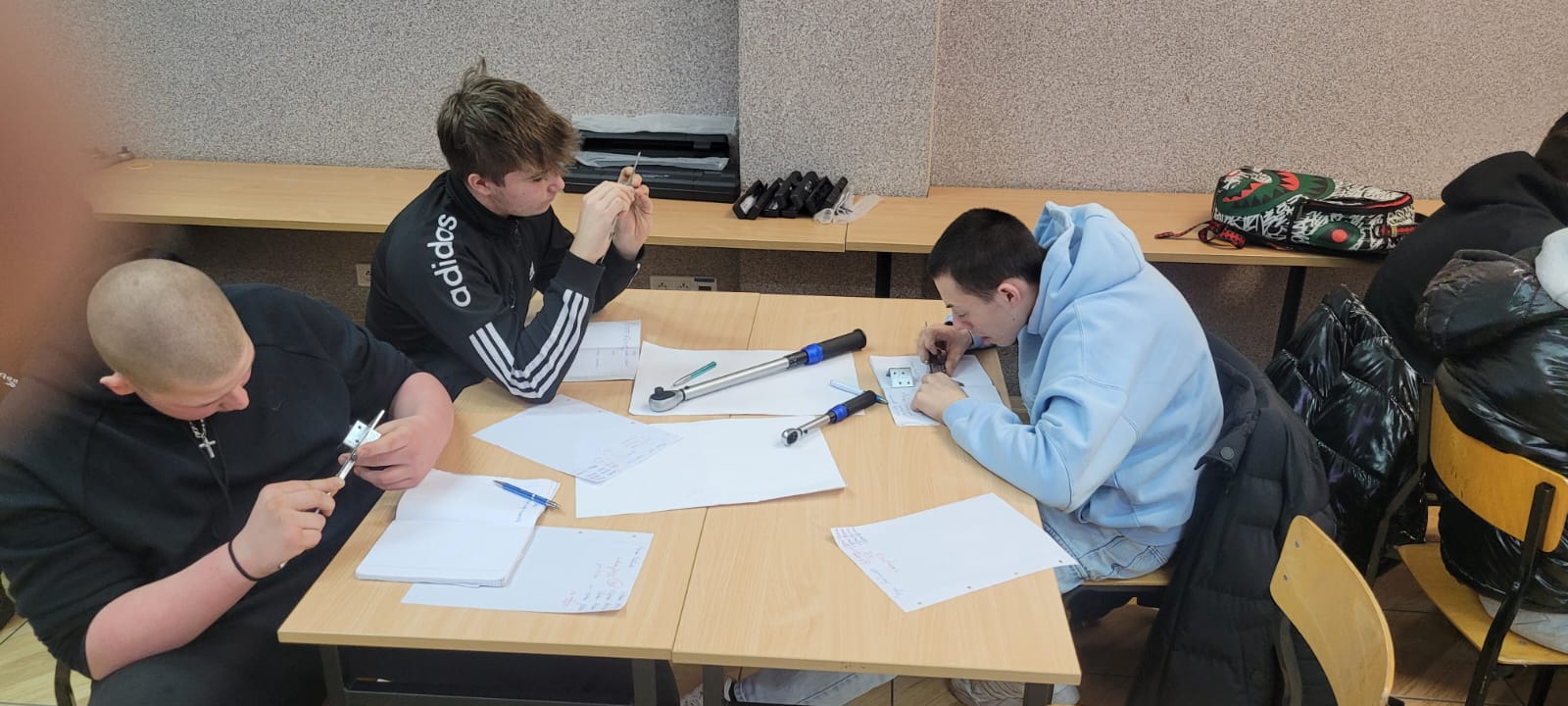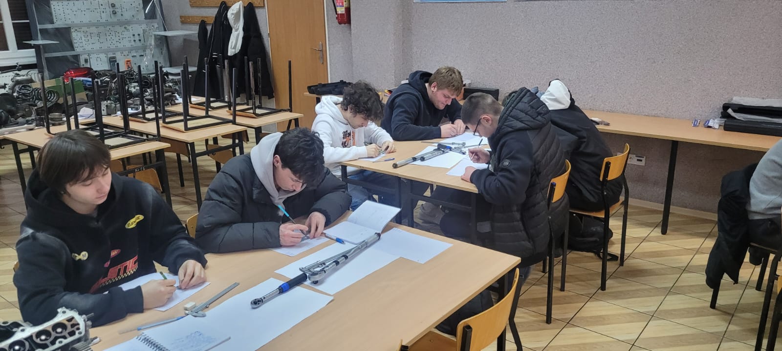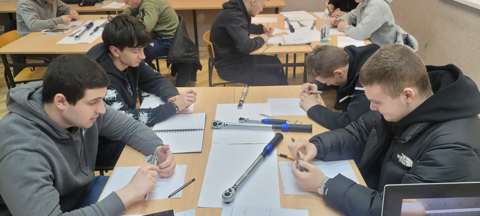 W tym tygodniu uczniowie klasy II B i II B w zawodzie mechanik pojazdów samochodowych na zajęciach z „Diagnostyki i naprawy pojazdów samochodowych” z Romanem Zięba wykonywali pomiary warsztatowe przygotowując się do egzaminu zawodowego. Wykonywali m.in. nastawianie kluczy dynamometrycznych na określone wartości momentów siły dokręcania połączeń śrubowych i pomiary grubości klocków hamulcowych z użyciem suwmiarki. Pomimo początkowych trudności wynik ostateczny był pozytywny co było wynikiem koncentracji i dokładności.