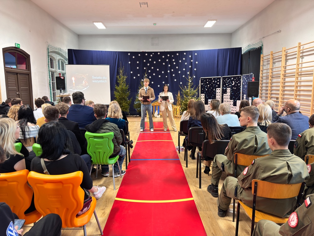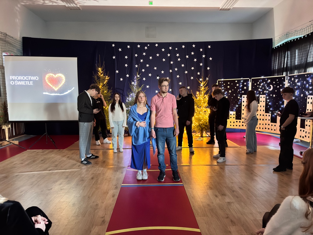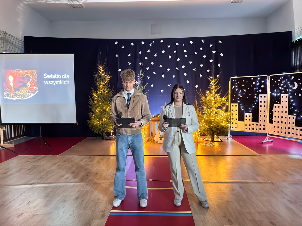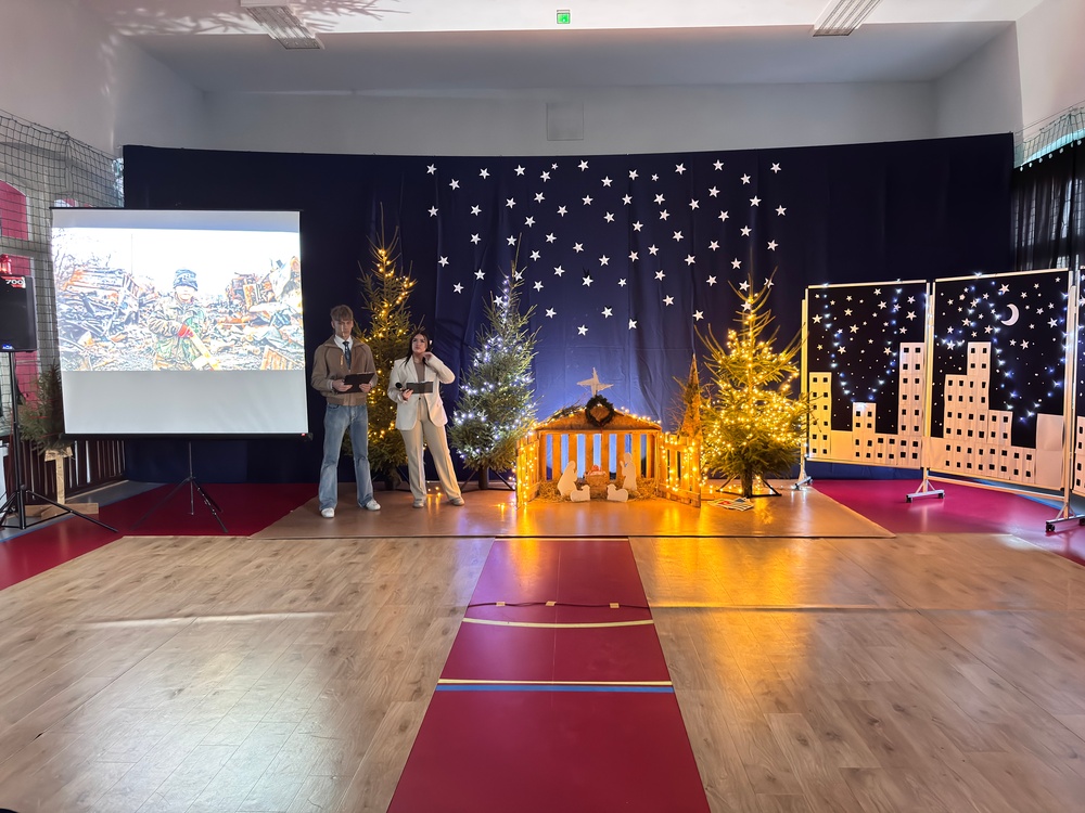 Szczególnym momentem były jasełka „Światło dla wszystkich”, przygotowane przez uczniów klasy 4 TSP wraz z wychowawczynią Agnieszką Pietraszek. Przedstawienie poprowadzili Janek Jankowiak oraz Julia Nakonieczna. To nie była tylko inscenizacja - to była opowieść o współczesnym świecie: pełnym hałasu, napięć, konfliktów i obojętności.