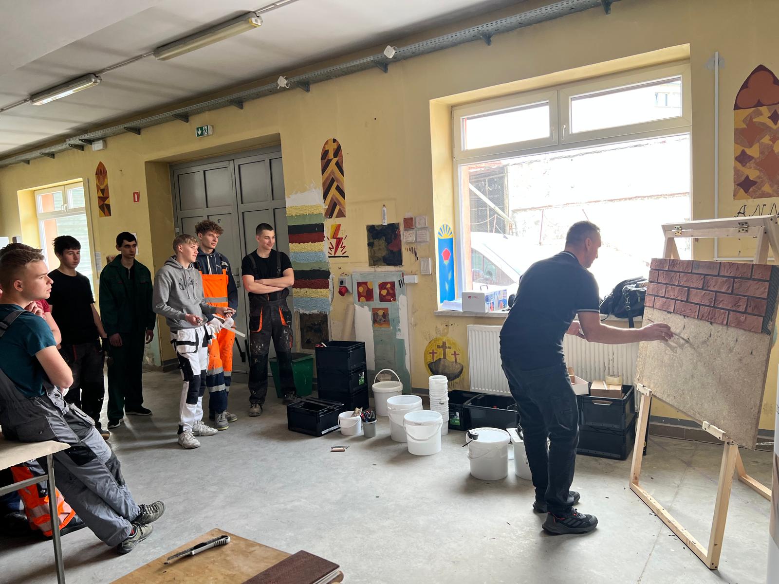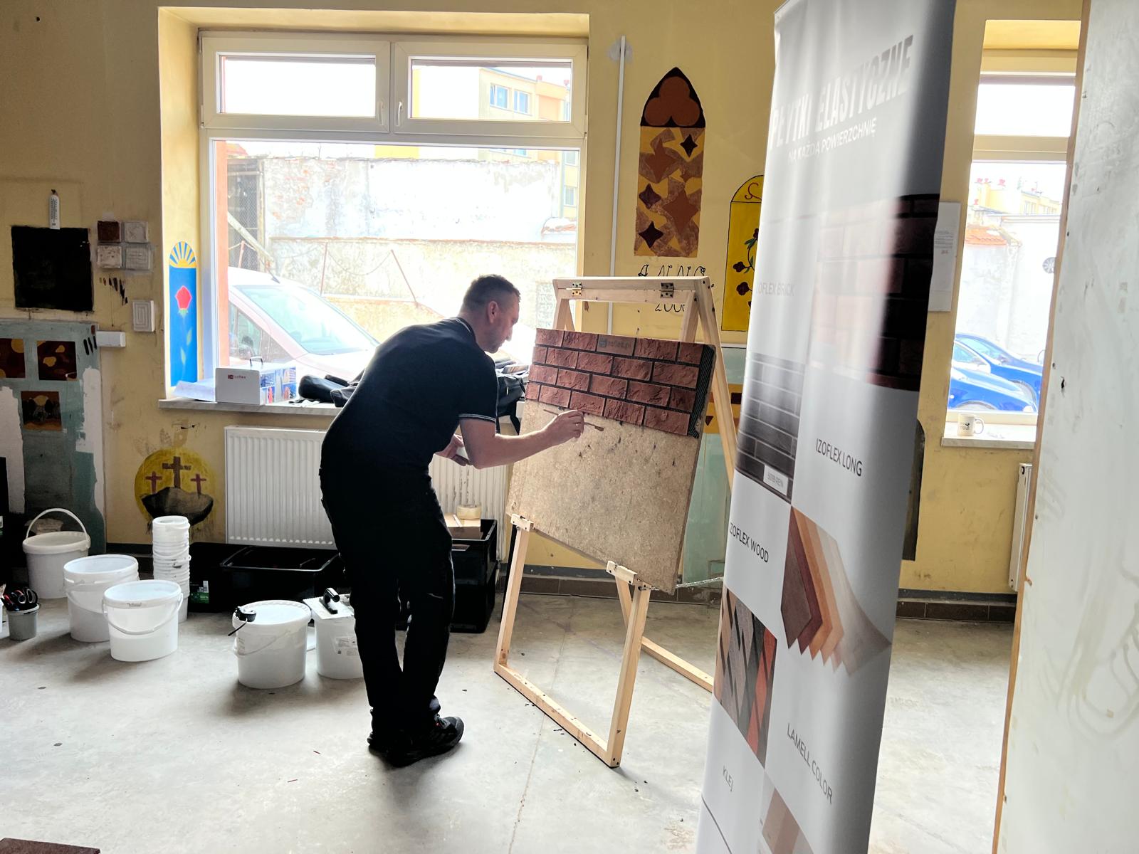 Najpierw odbyło się krótkie wprowadzenie teoretyczne. Uczniowie poznali właściwości elastycznych płytek Izoflex, ich zalety oraz szerokie zastosowanie zarówno na elewacjach, jak i we wnętrzach.