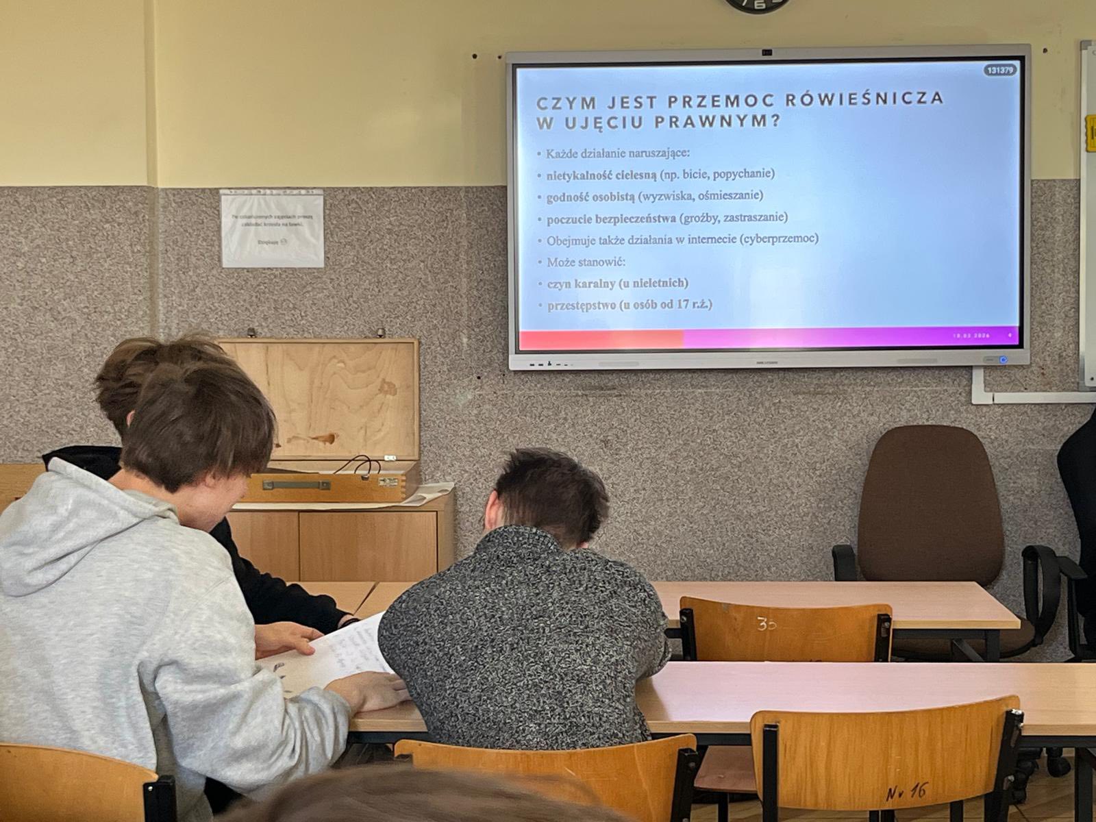 Warsztaty przybliżyły również prawne aspekty przemocy rówieśniczej. Uczniowie dowiedzieli się, że każde działanie naruszające nietykalność cielesną, godność osobistą czy poczucie bezpieczeństwa, a także cyberprzemoc, może być traktowane jako: