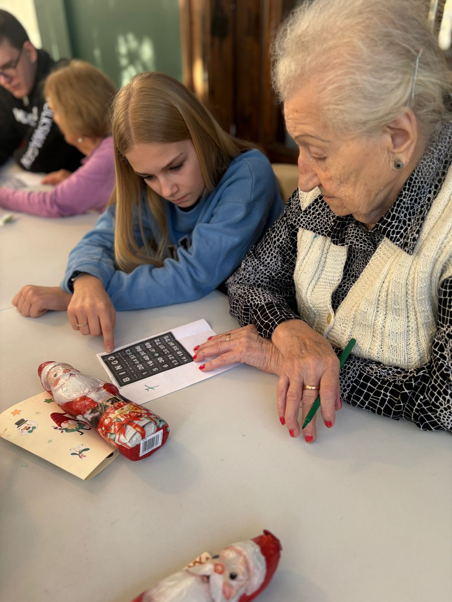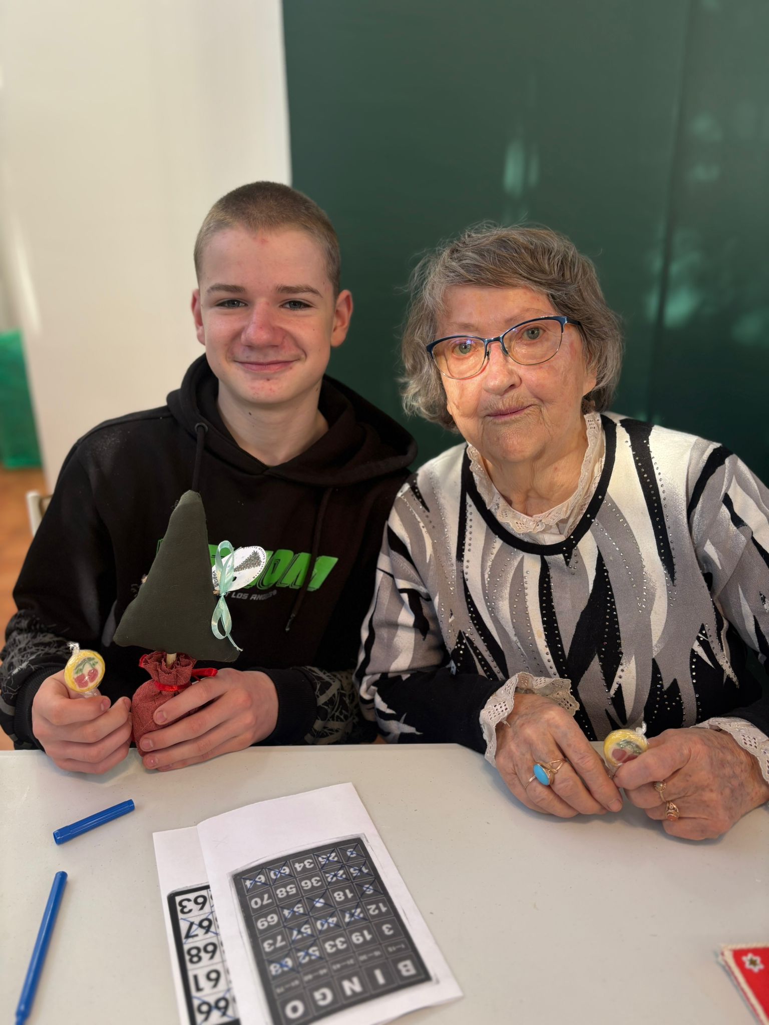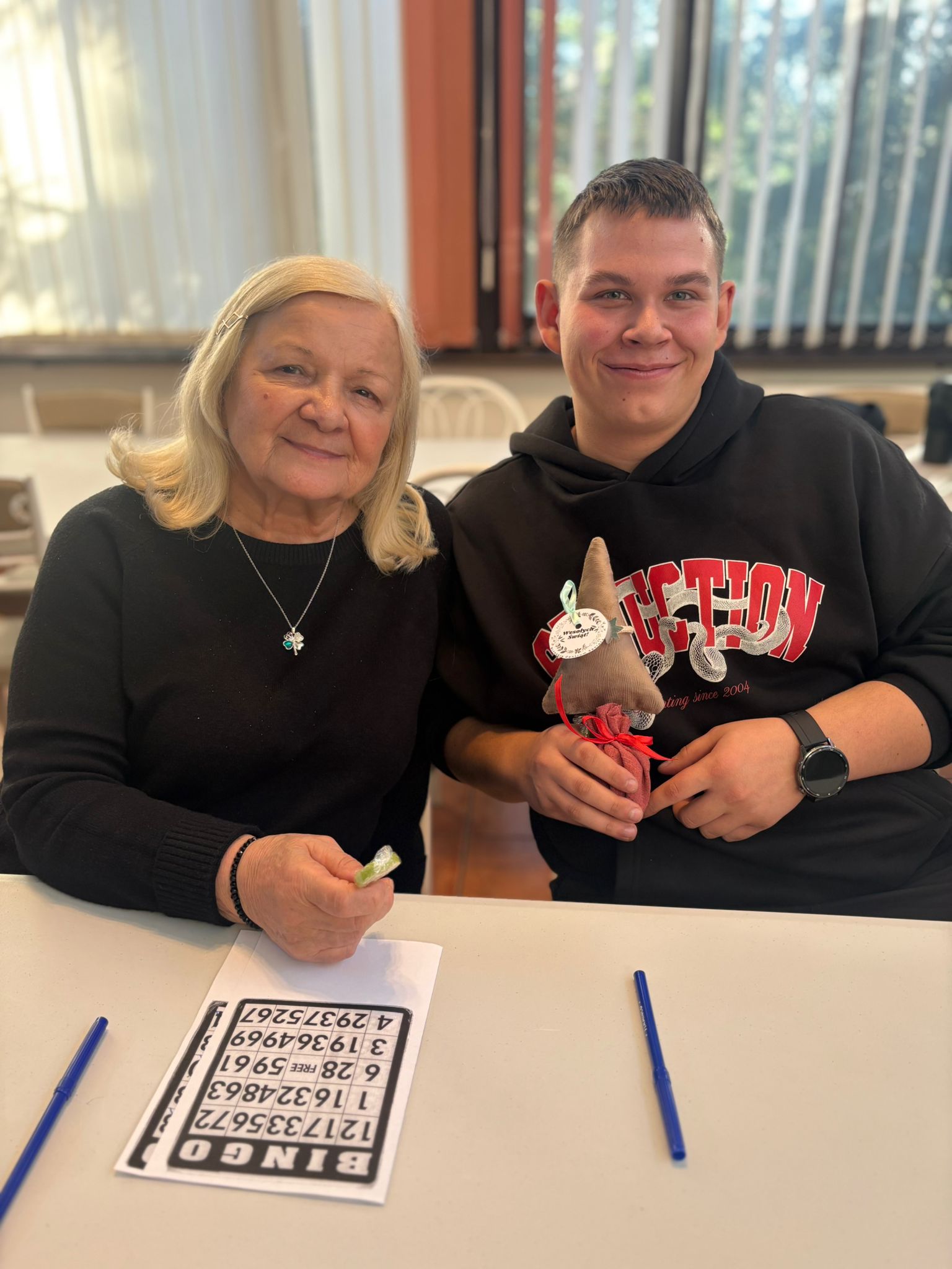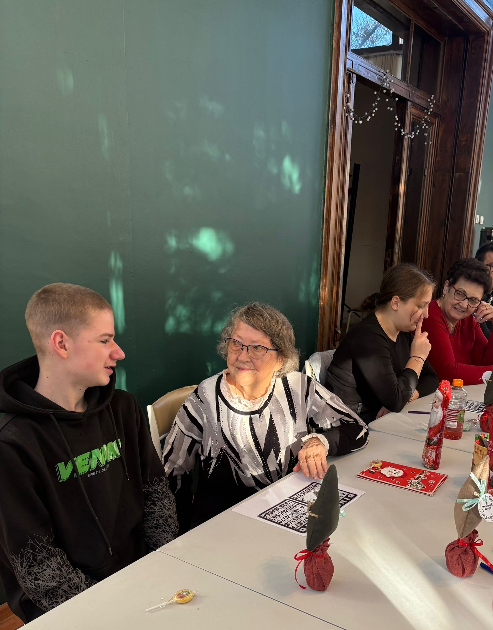 Nie zabrakło też wspólnej zabawy – seniorzy i młodzież grali razem w bingo, dzielili się opowieściami, a także pytali o szkołę, rodzinę i codzienne sprawy. Takie chwile pokazują, że obecność i zaangażowanie są cenniejsze niż jakiekolwiek prezenty.