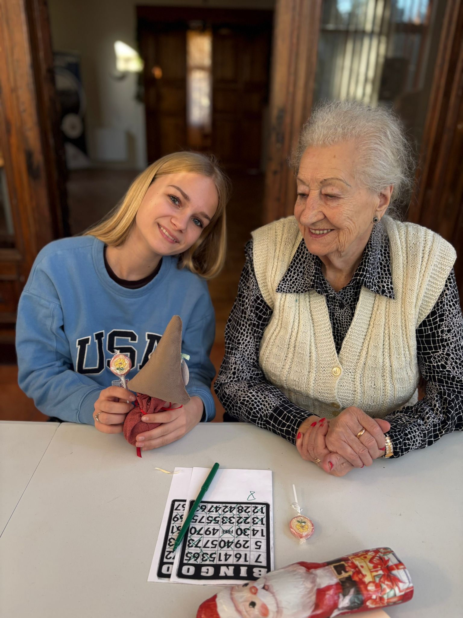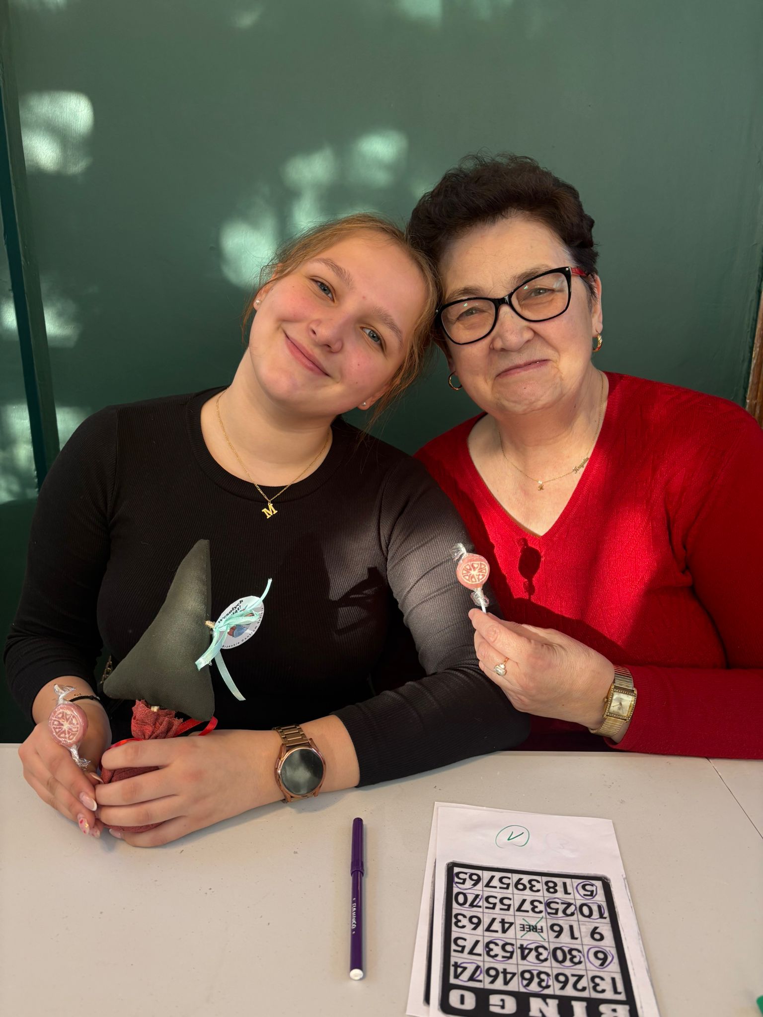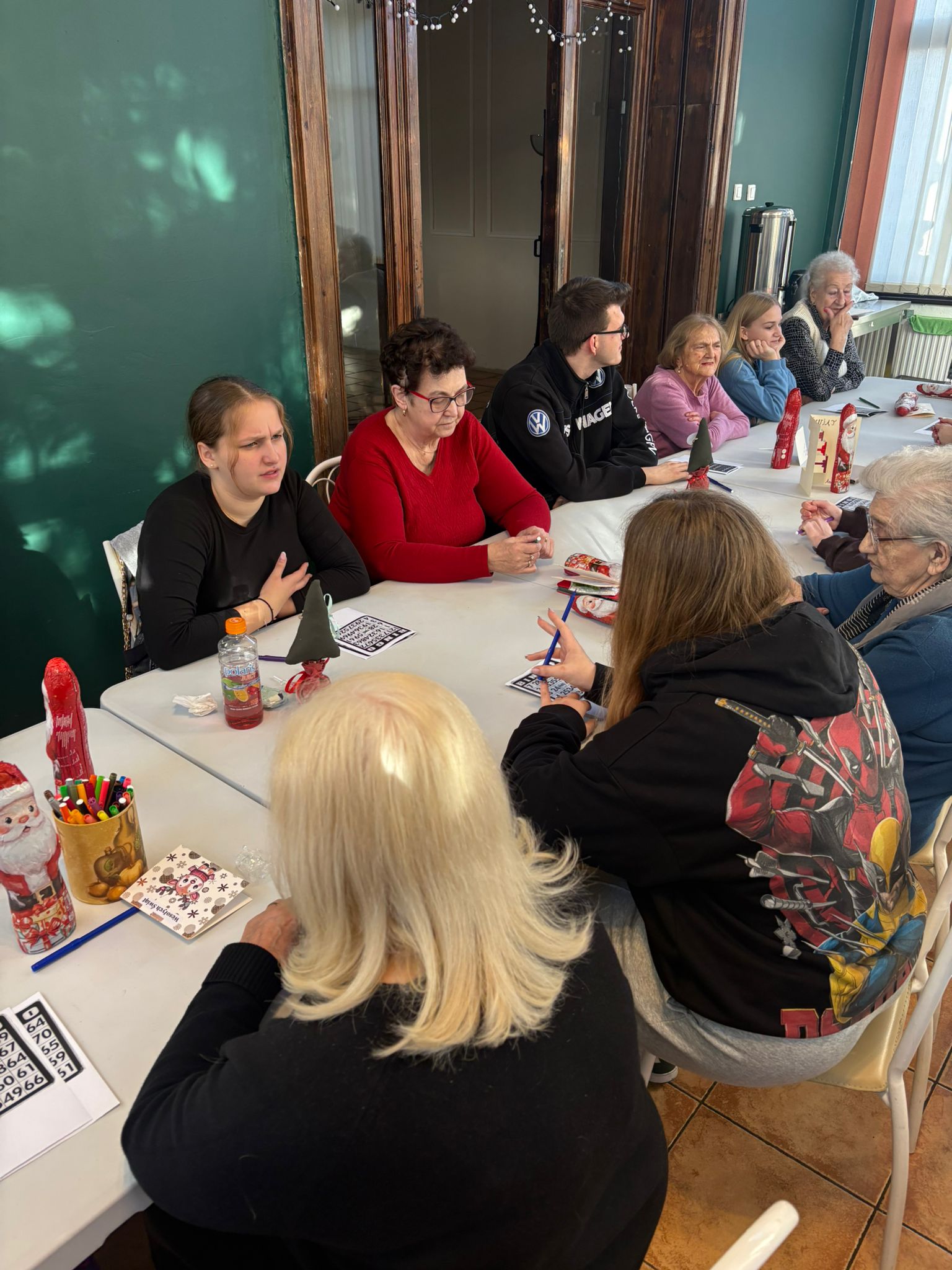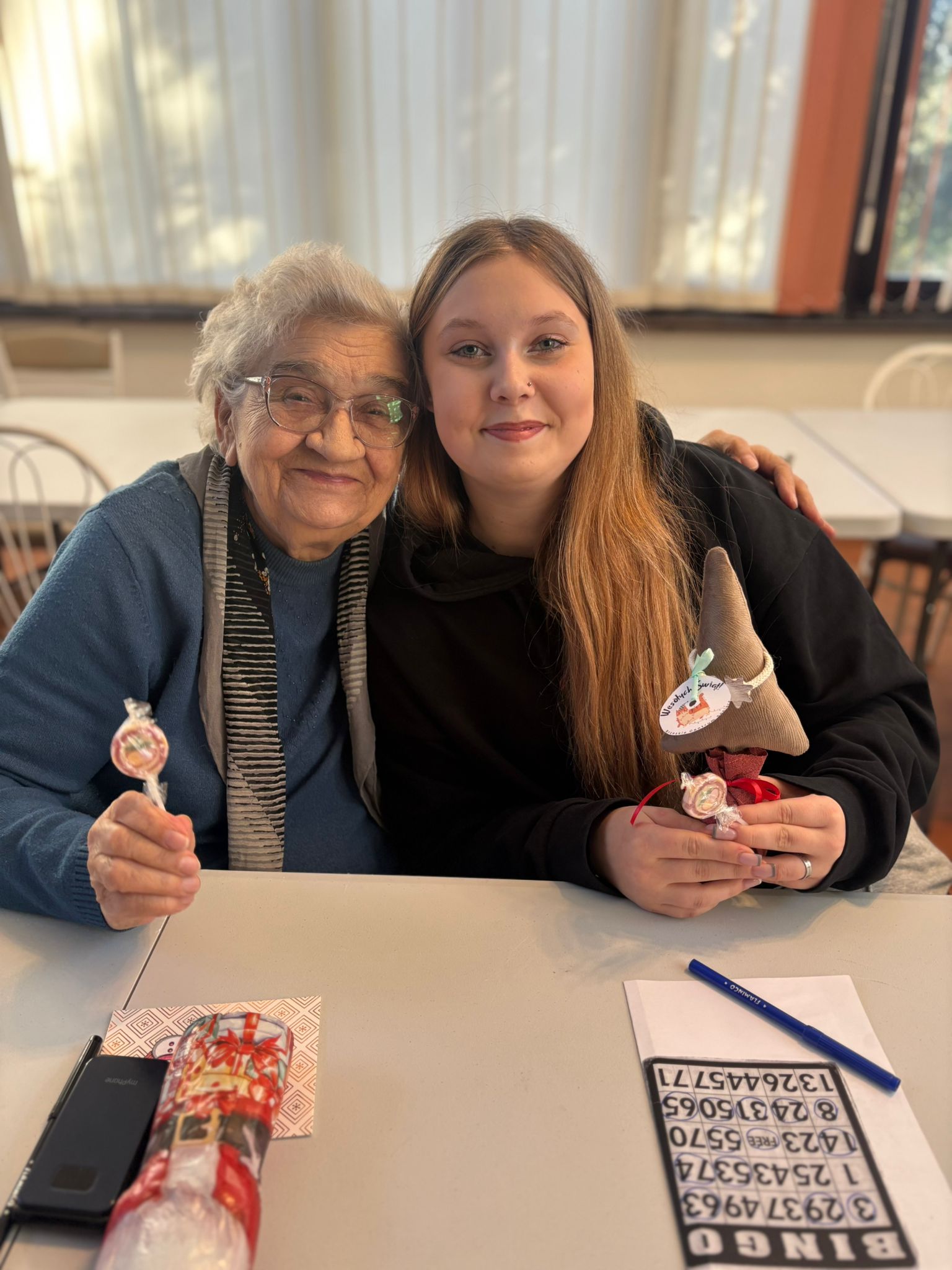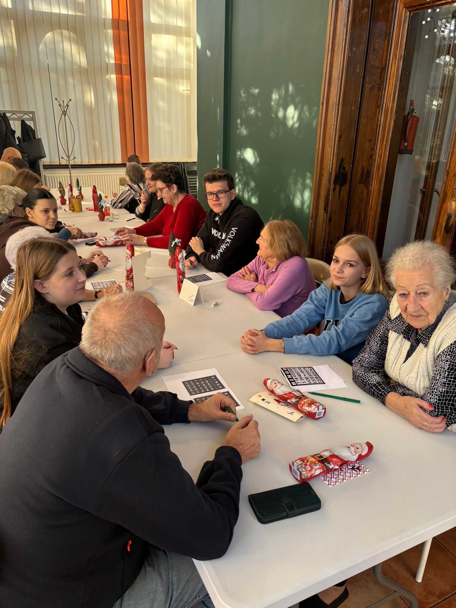 Nie zabrakło też wspólnej zabawy – seniorzy i młodzież grali razem w bingo, dzielili się opowieściami, a także pytali o szkołę, rodzinę i codzienne sprawy. Takie chwile pokazują, że obecność i zaangażowanie są cenniejsze niż jakiekolwiek prezenty.