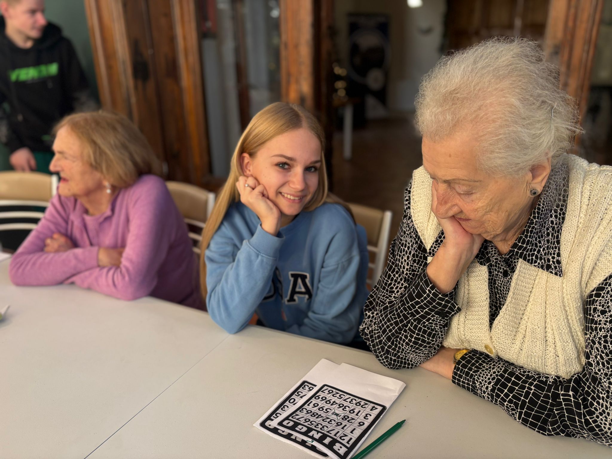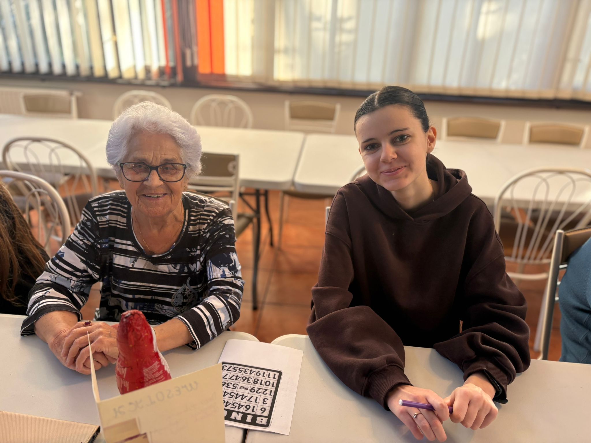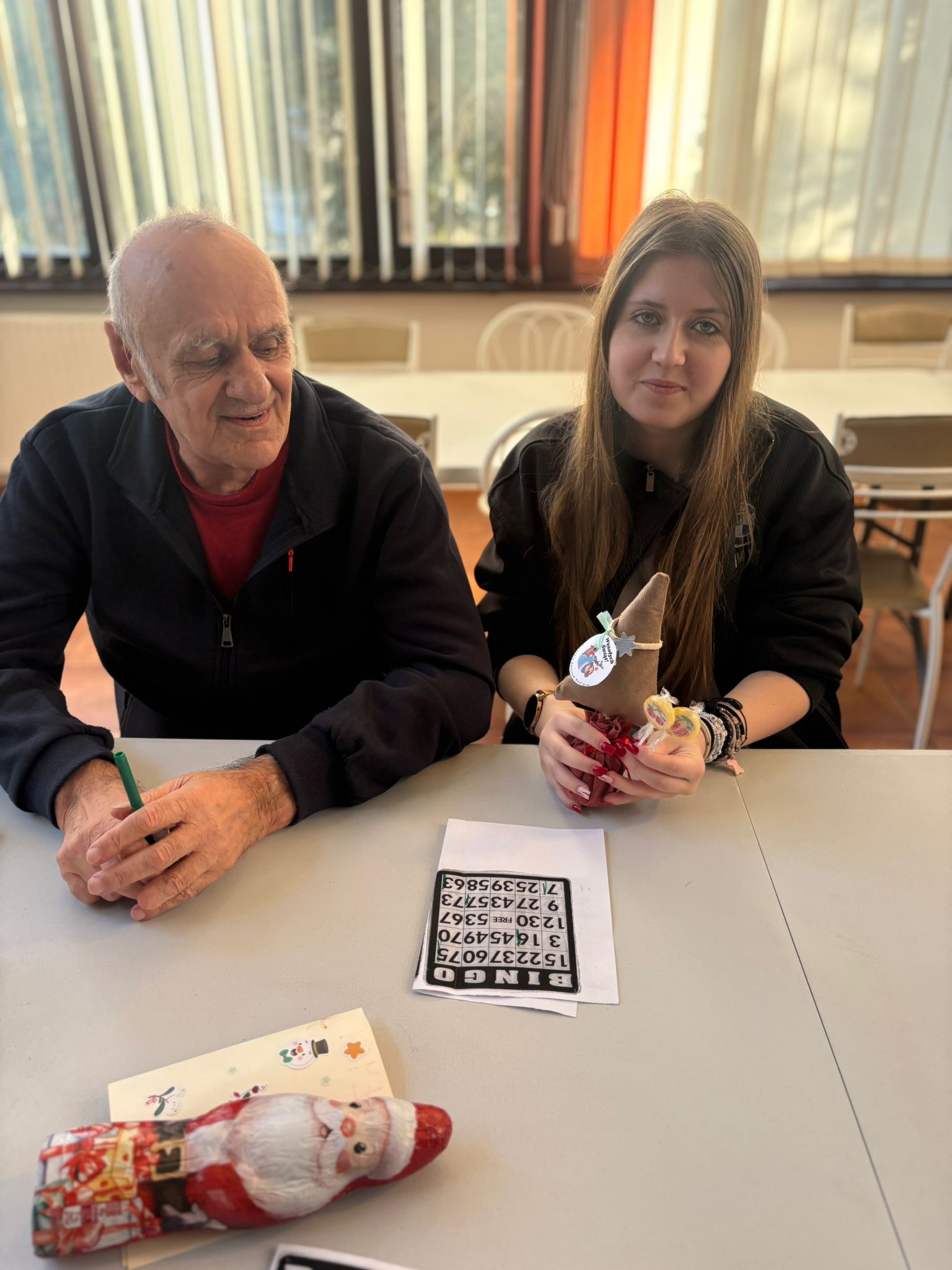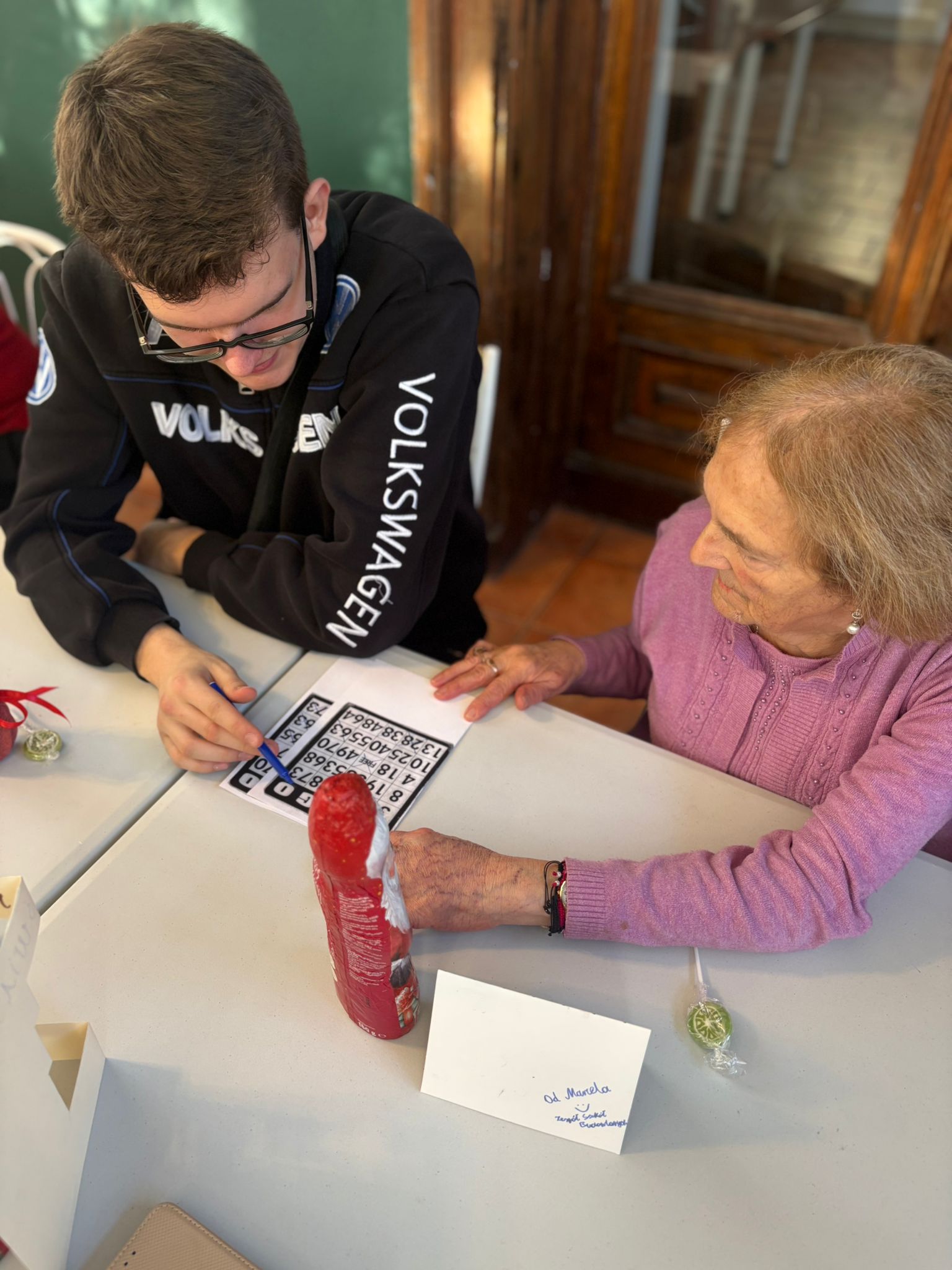 Nie zabrakło też wspólnej zabawy – seniorzy i młodzież grali razem w bingo, dzielili się opowieściami, a także pytali o szkołę, rodzinę i codzienne sprawy. Takie chwile pokazują, że obecność i zaangażowanie są cenniejsze niż jakiekolwiek prezenty.