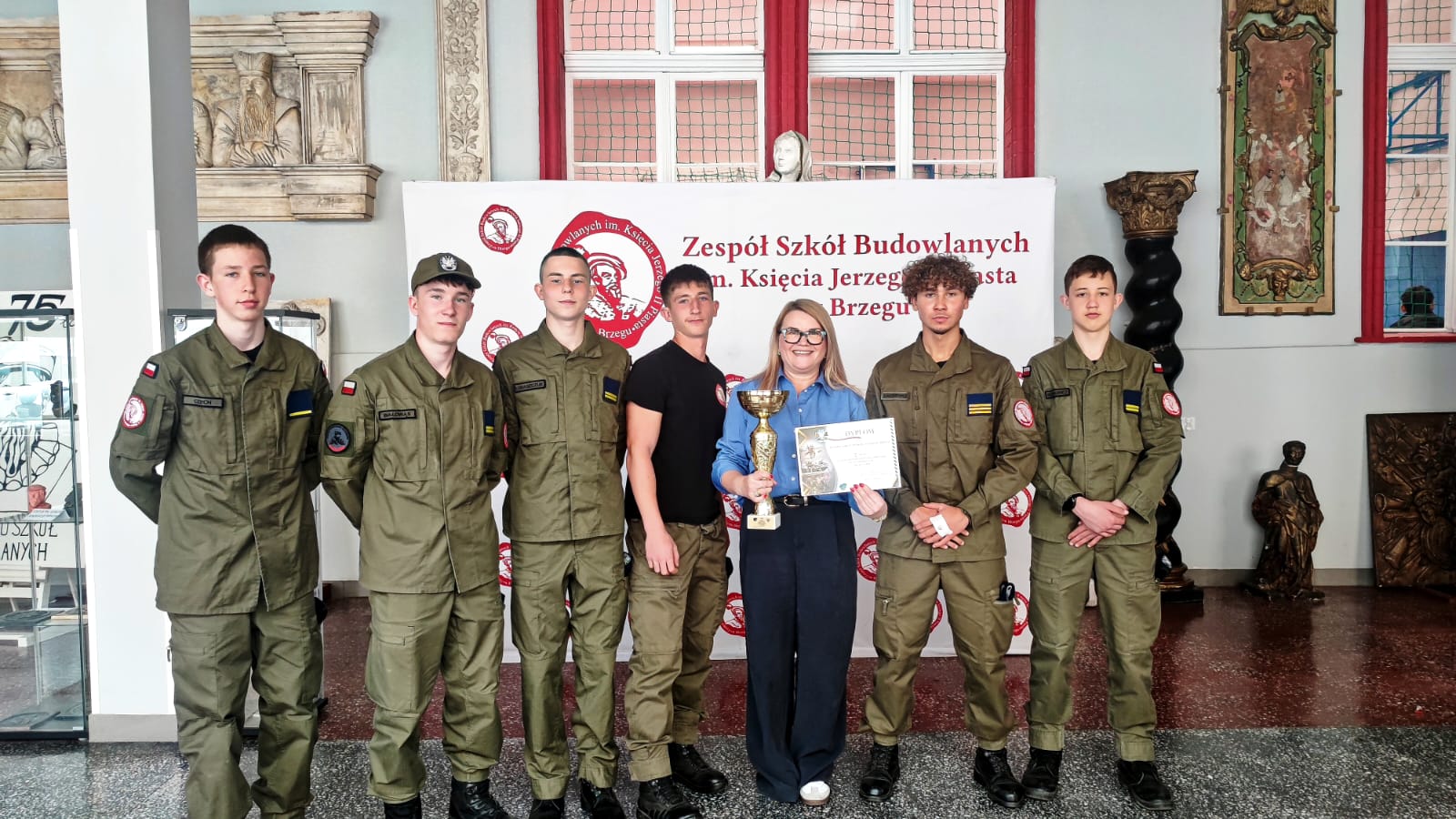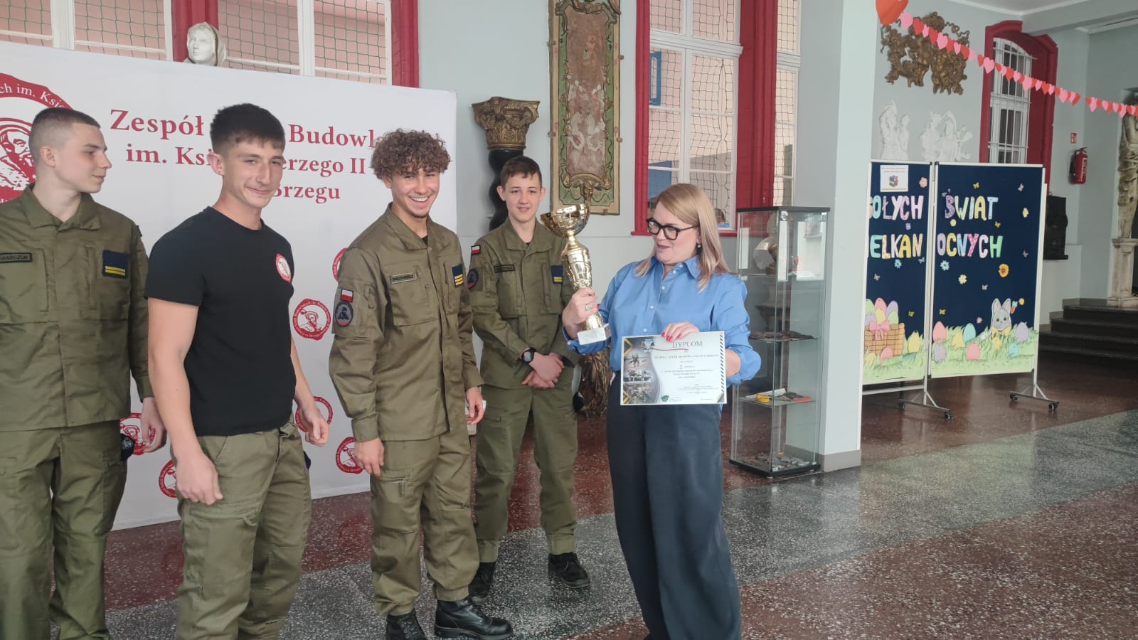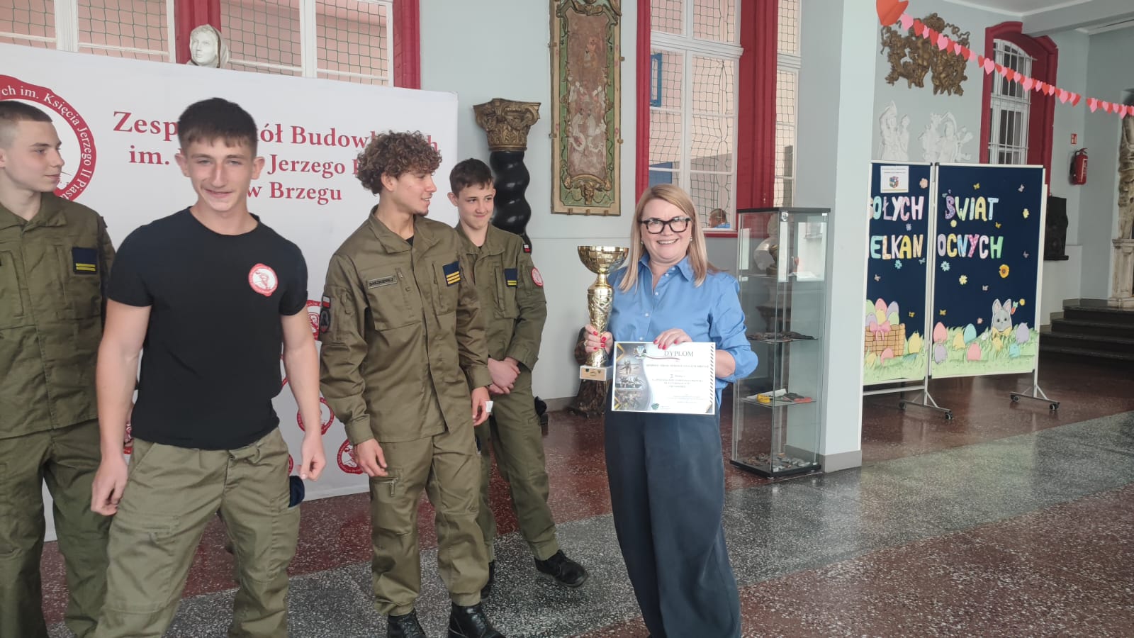 Po powrocie do szkoły uczniowie z dumą zaprezentowali zdobyty puchar Pani Dyrektor, która złożyła im gratulacje. Nie zabrakło również wspólnego zdjęcia upamiętniającego ten wyjątkowy moment.